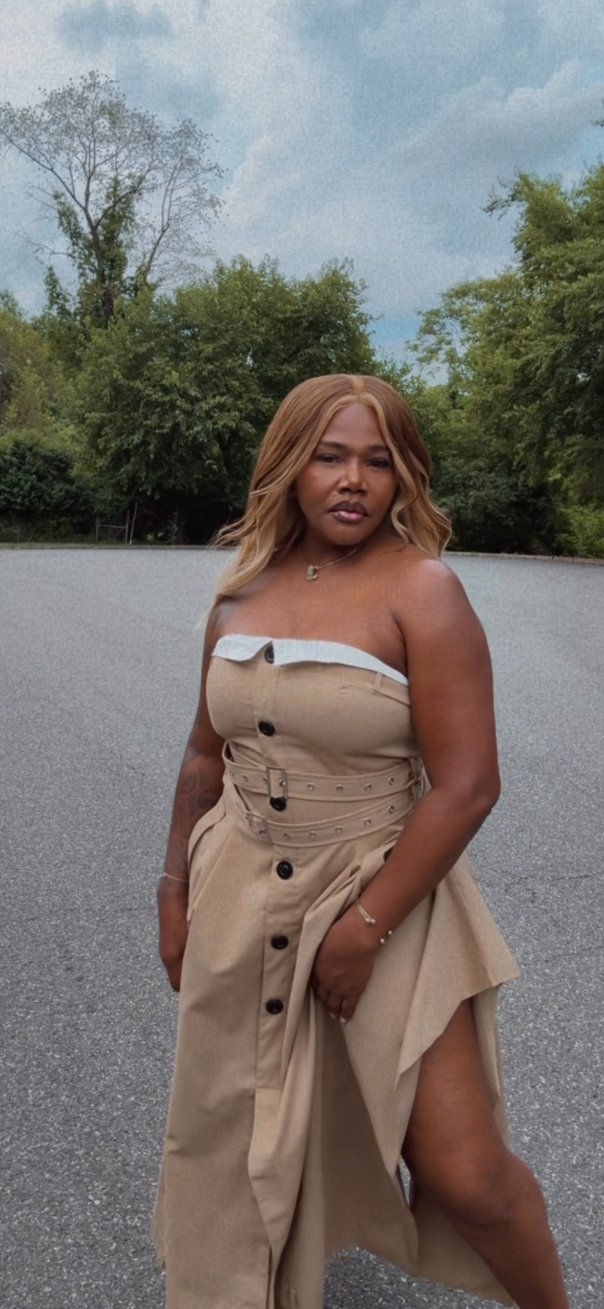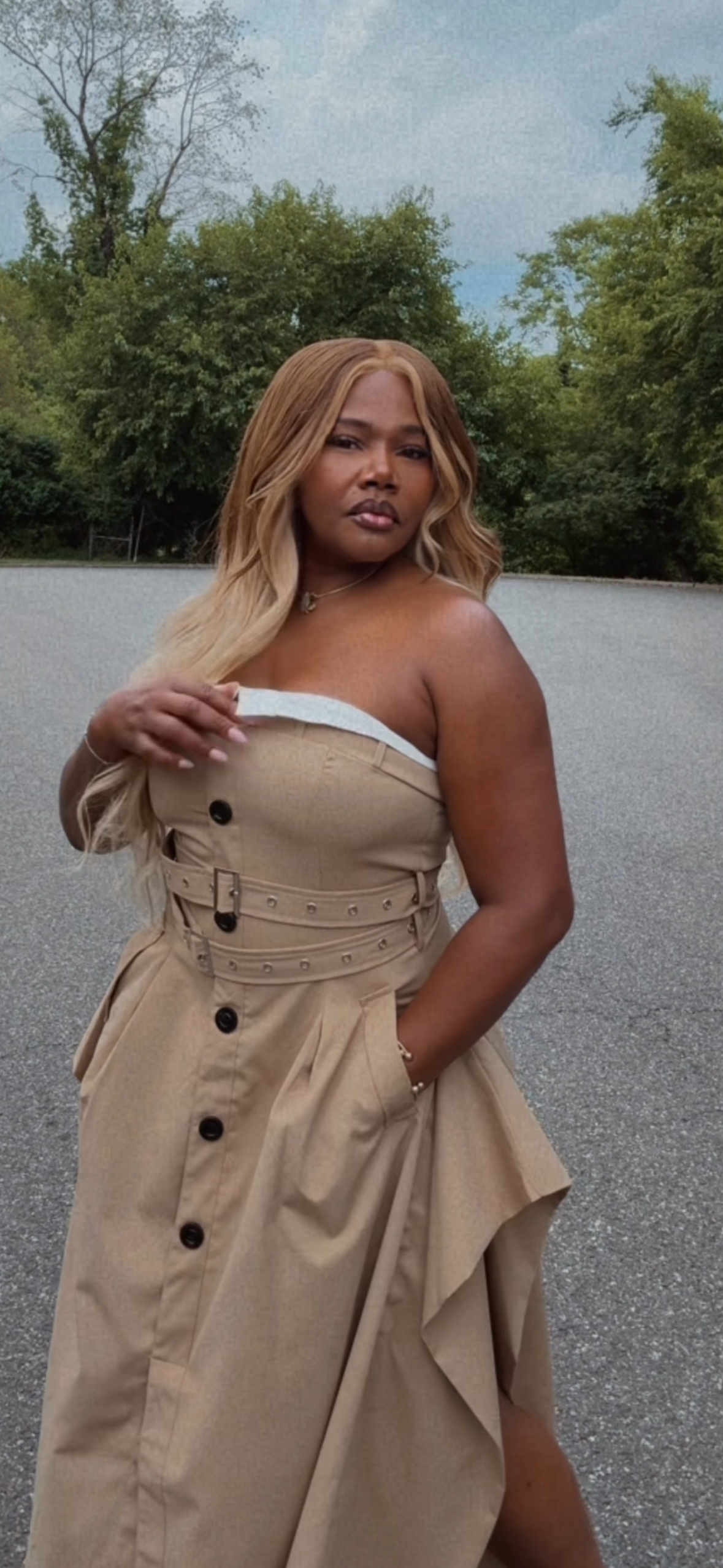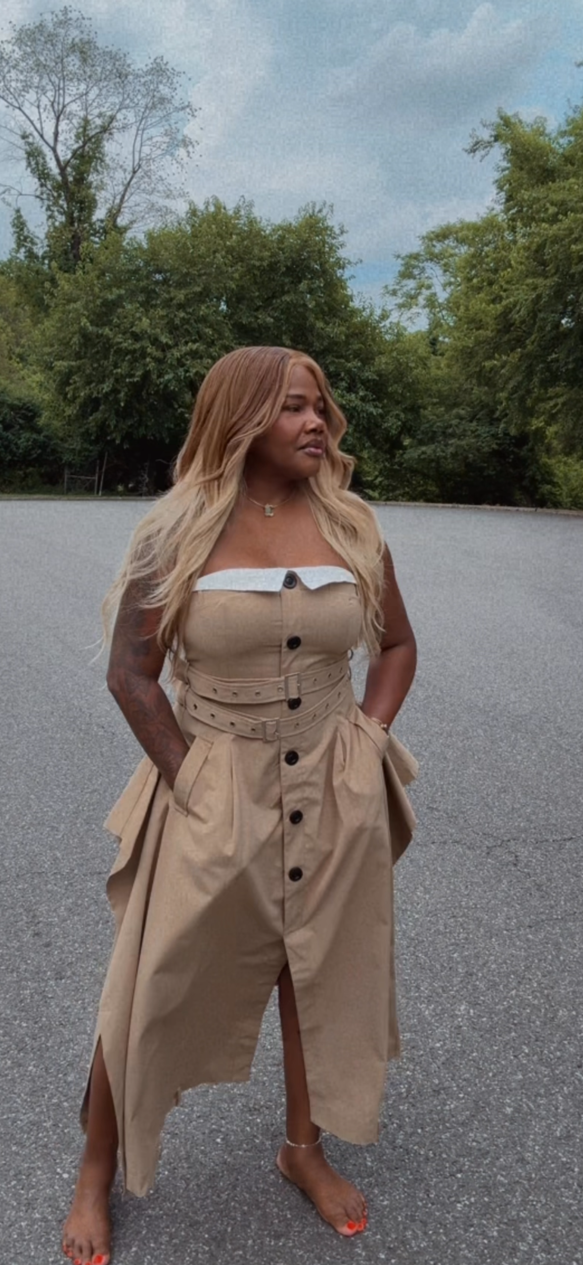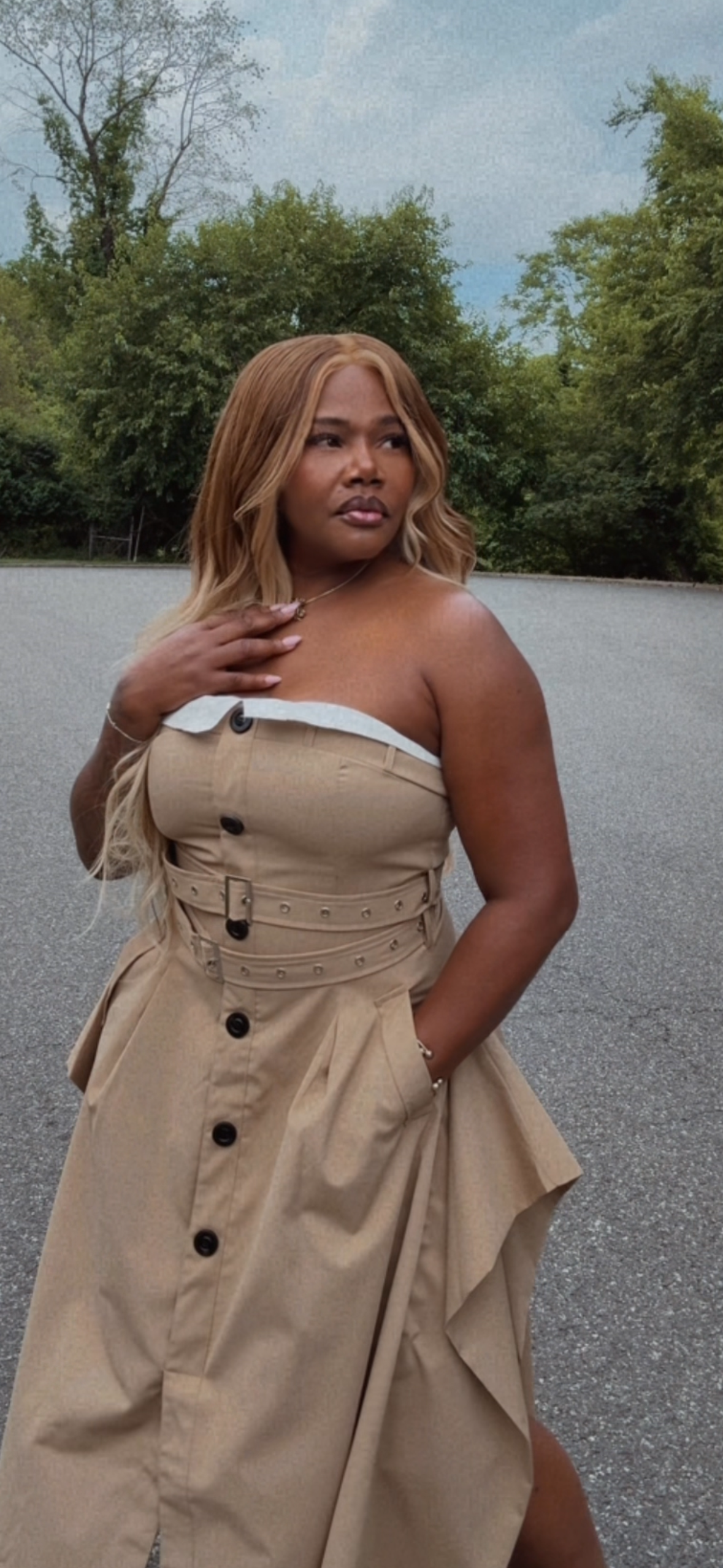 The Chic Reinvented Trench Maxi Dress is where timeless sophistication meets contemporary edge. Designed to mimic the classic trench coat silhouette, this strapless maxi dress features a structured button-down front, wide belt detailing for a cinched waist, and oversized pockets for a functional yet fashion-forward touch. The contrast fold-over collar adds an unexpected pop of refinement, while the full A-line skirt creates a dramatic, structured finish. - Strapless trench coat-inspired design - Button-down front with classic trench details - Wide belt with statement buckle for waist definition - Oversized pockets for both function and style - A-line maxi silhouette for an elegant, structured look