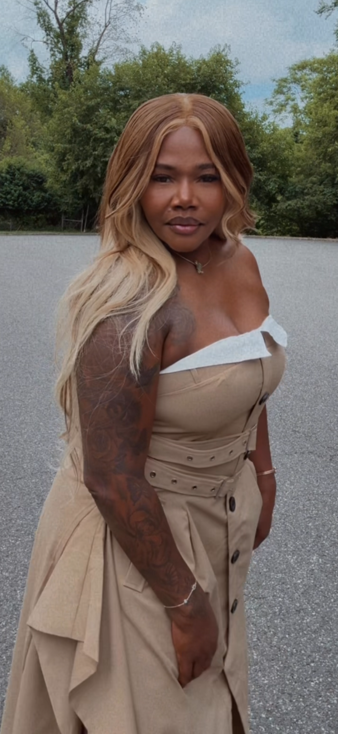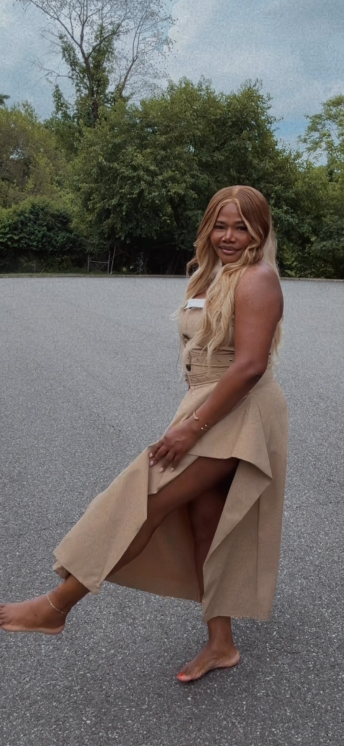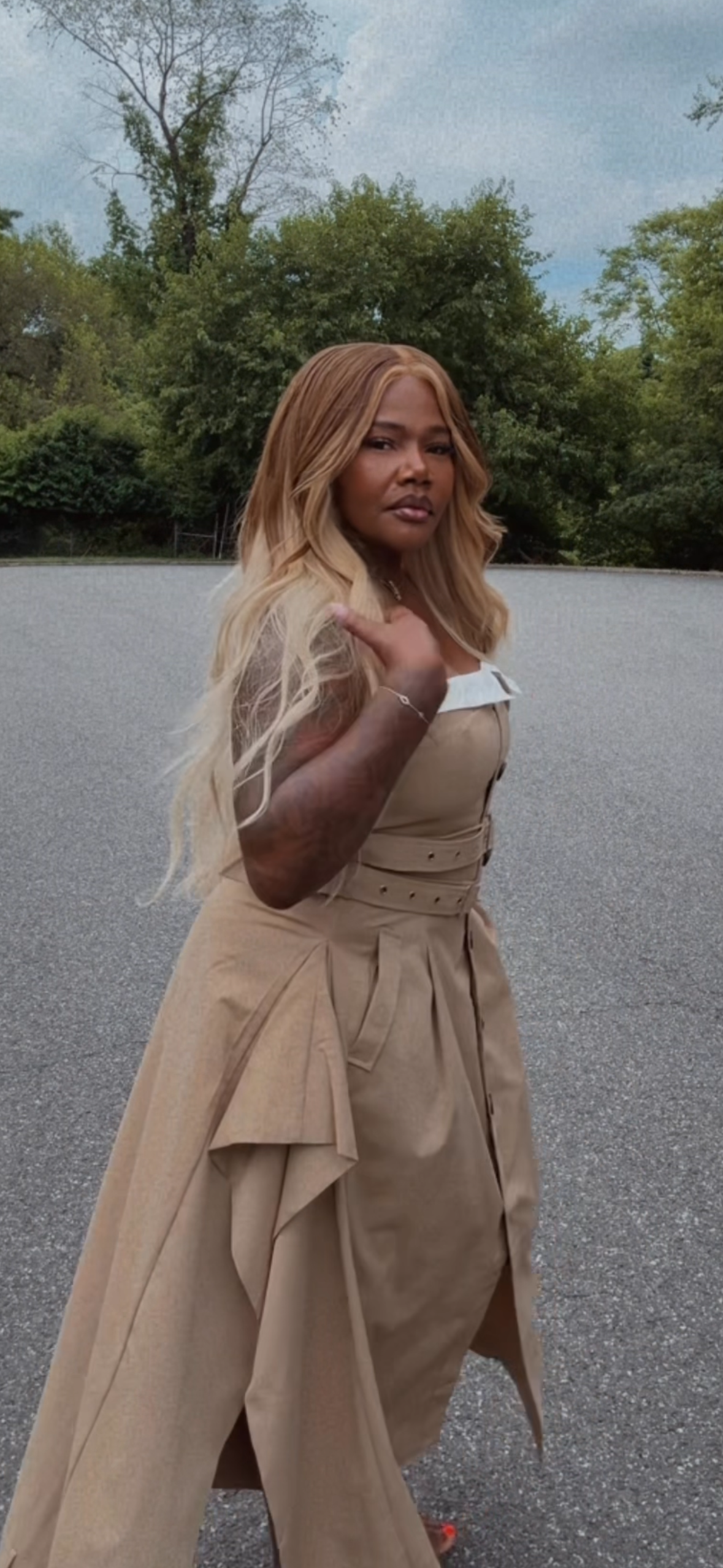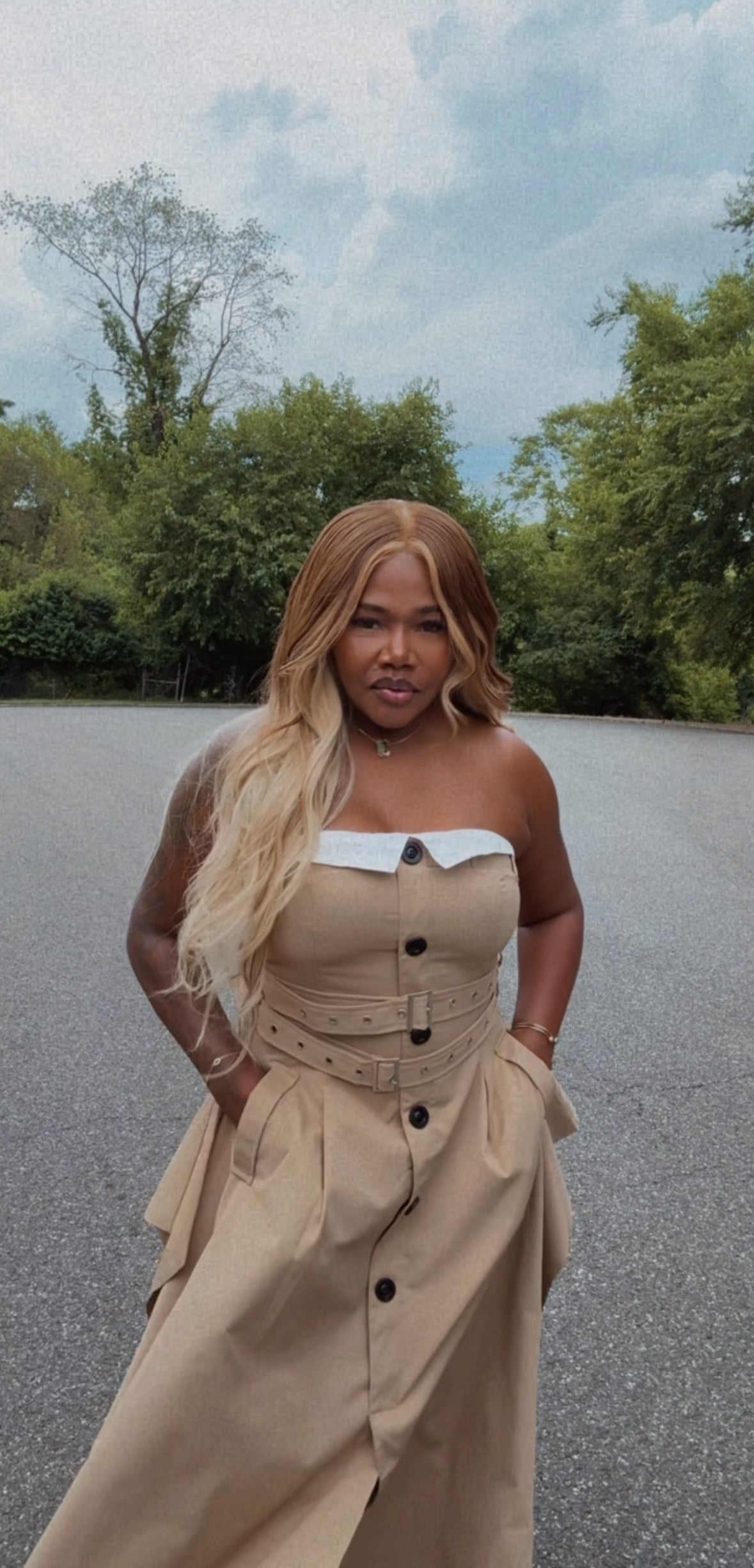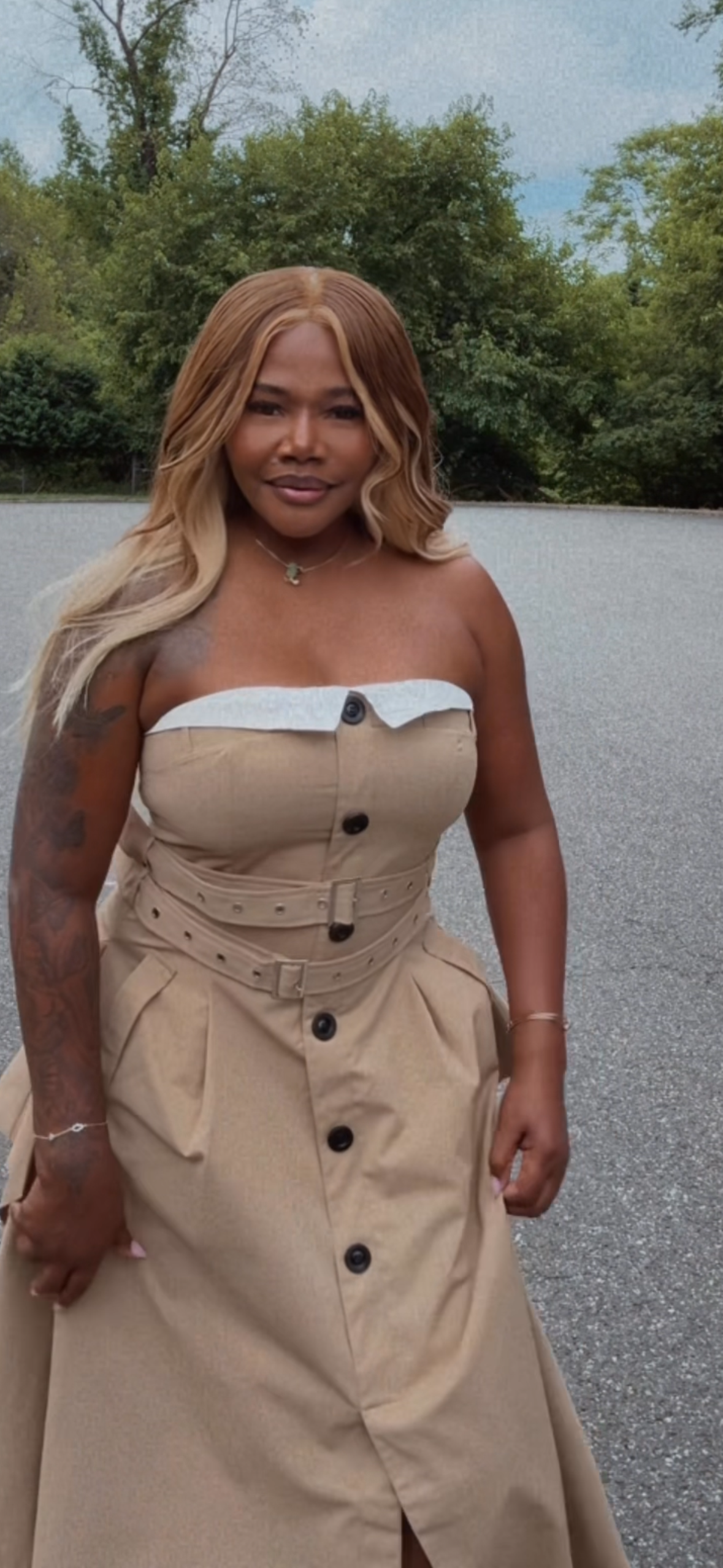 The Chic Reinvented Trench Maxi Dress is where timeless sophistication meets contemporary edge. Designed to mimic the classic trench coat silhouette, this strapless maxi dress features a structured button-down front, wide belt detailing for a cinched waist, and oversized pockets for a functional yet fashion-forward touch. The contrast fold-over collar adds an unexpected pop of refinement, while the full A-line skirt creates a dramatic, structured finish. - Strapless trench coat-inspired design - Button-down front with classic trench details - Wide belt with statement buckle for waist definition - Oversized pockets for both function and style - A-line maxi silhouette for an elegant, structured look