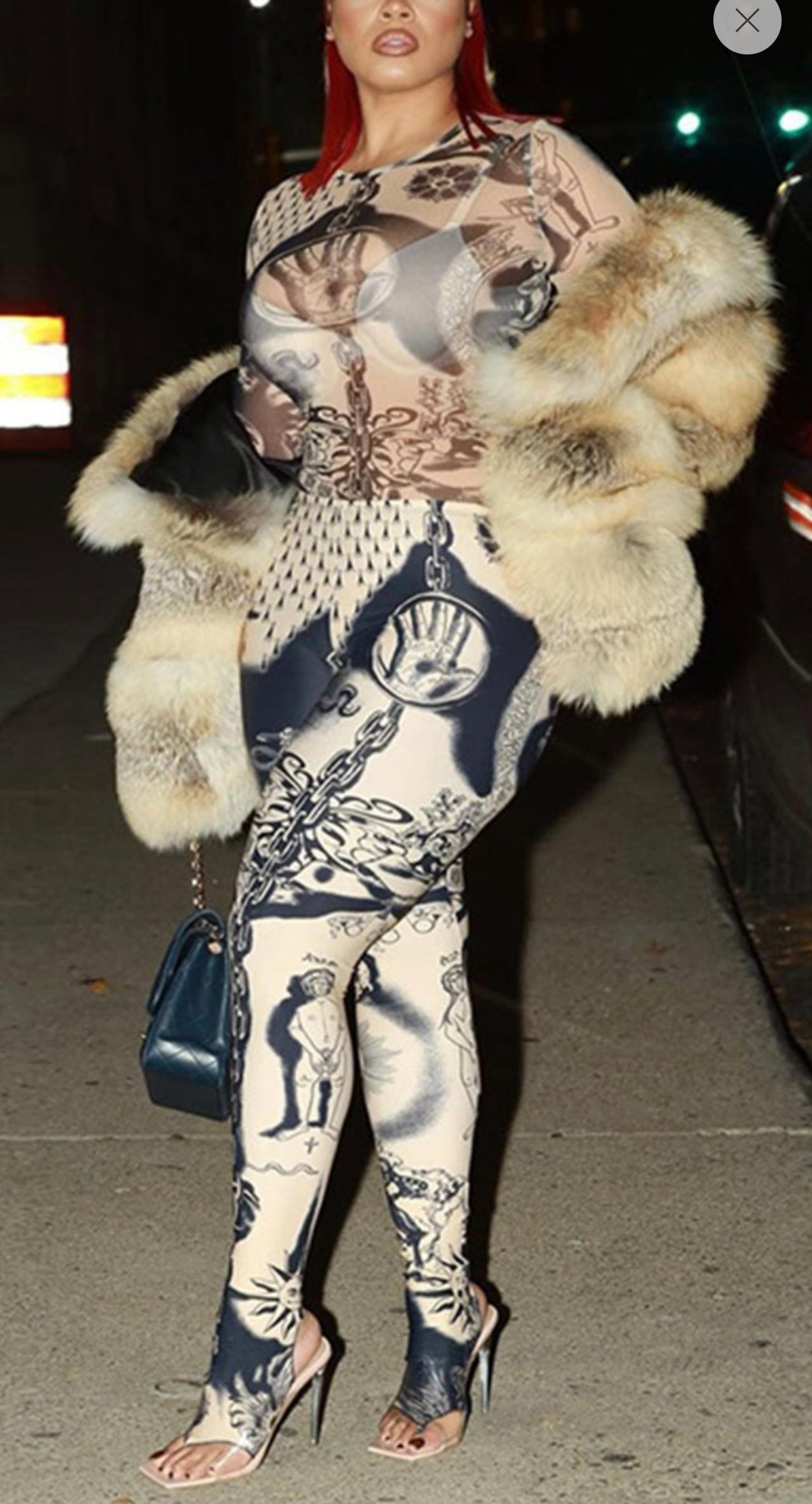 Fabulous round neck long sleeves printed mesh top featuring high waist footed slim pants set. great stretch.