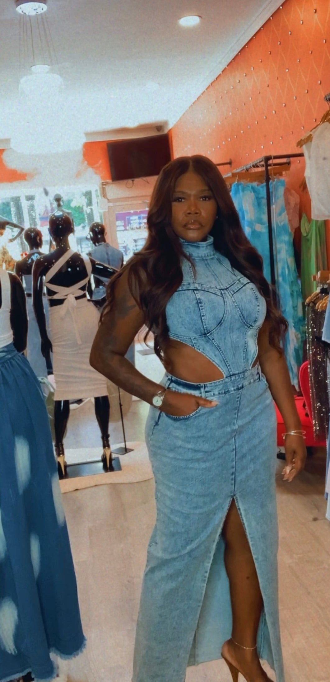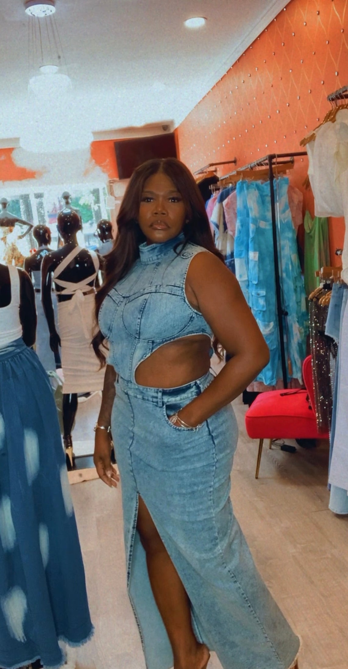 You so pretty in this Denim maxi dress features a mock neckline, sexy side cut outs and a front slit that adds just the right amount of edge. The frayed hem and back zipper closure provide a touch of rugged charm. This dress has great stretch that you'll look sexy and stylish in.