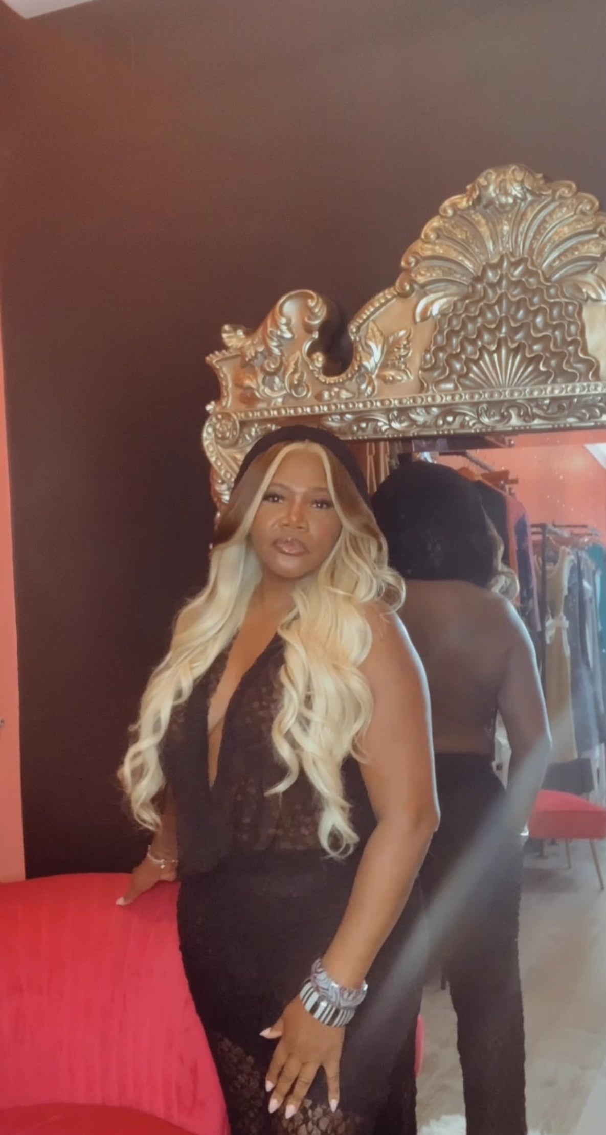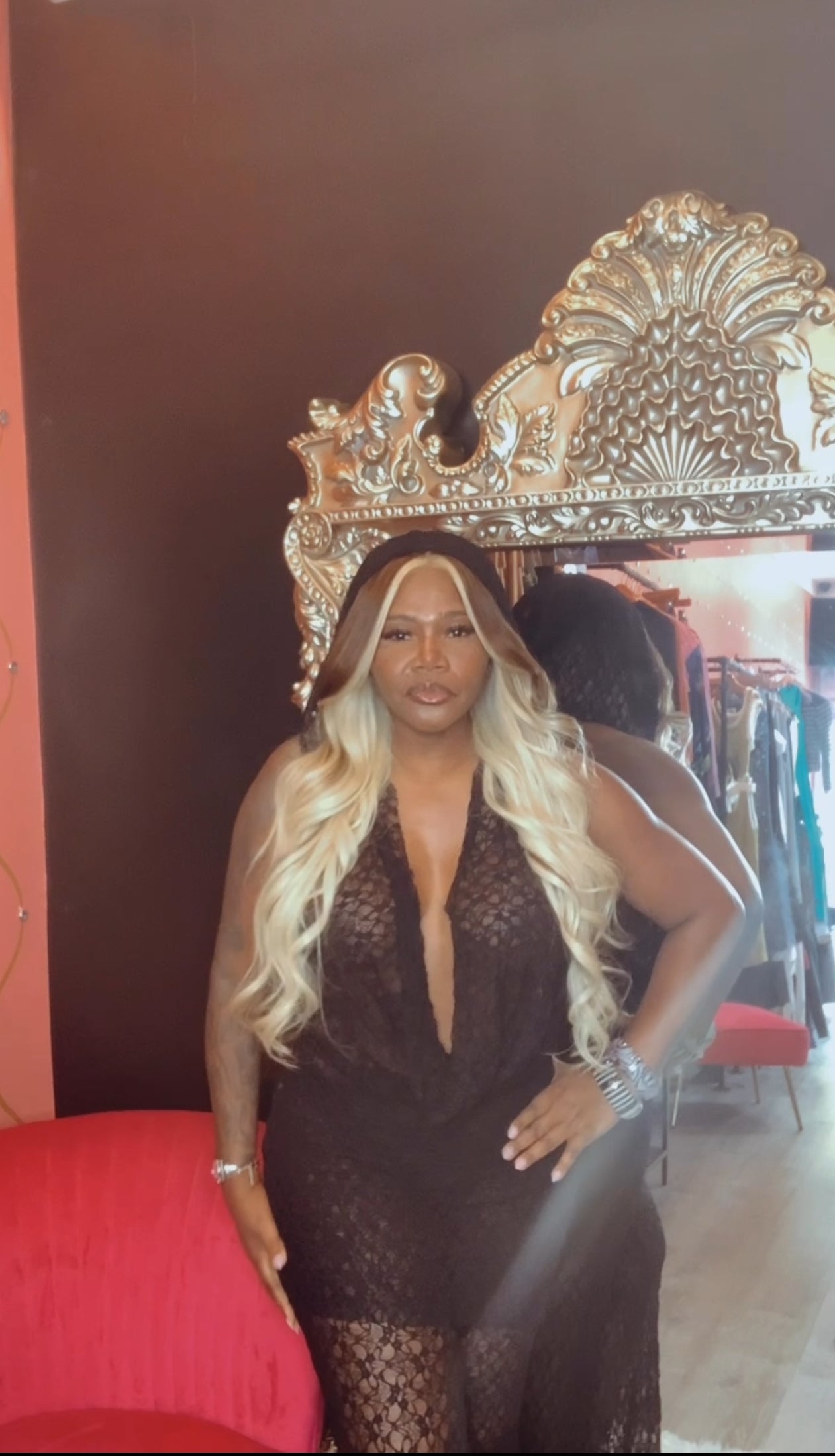 We outside eating in this hooded cowl neck, open back top and flared pants. Features sheer lace fabric and stretch.