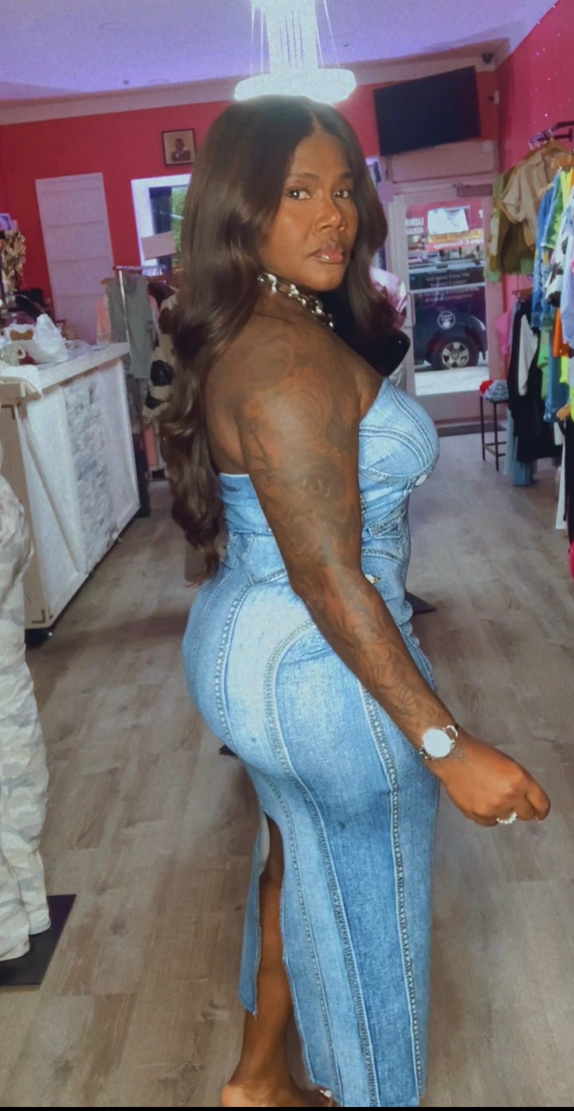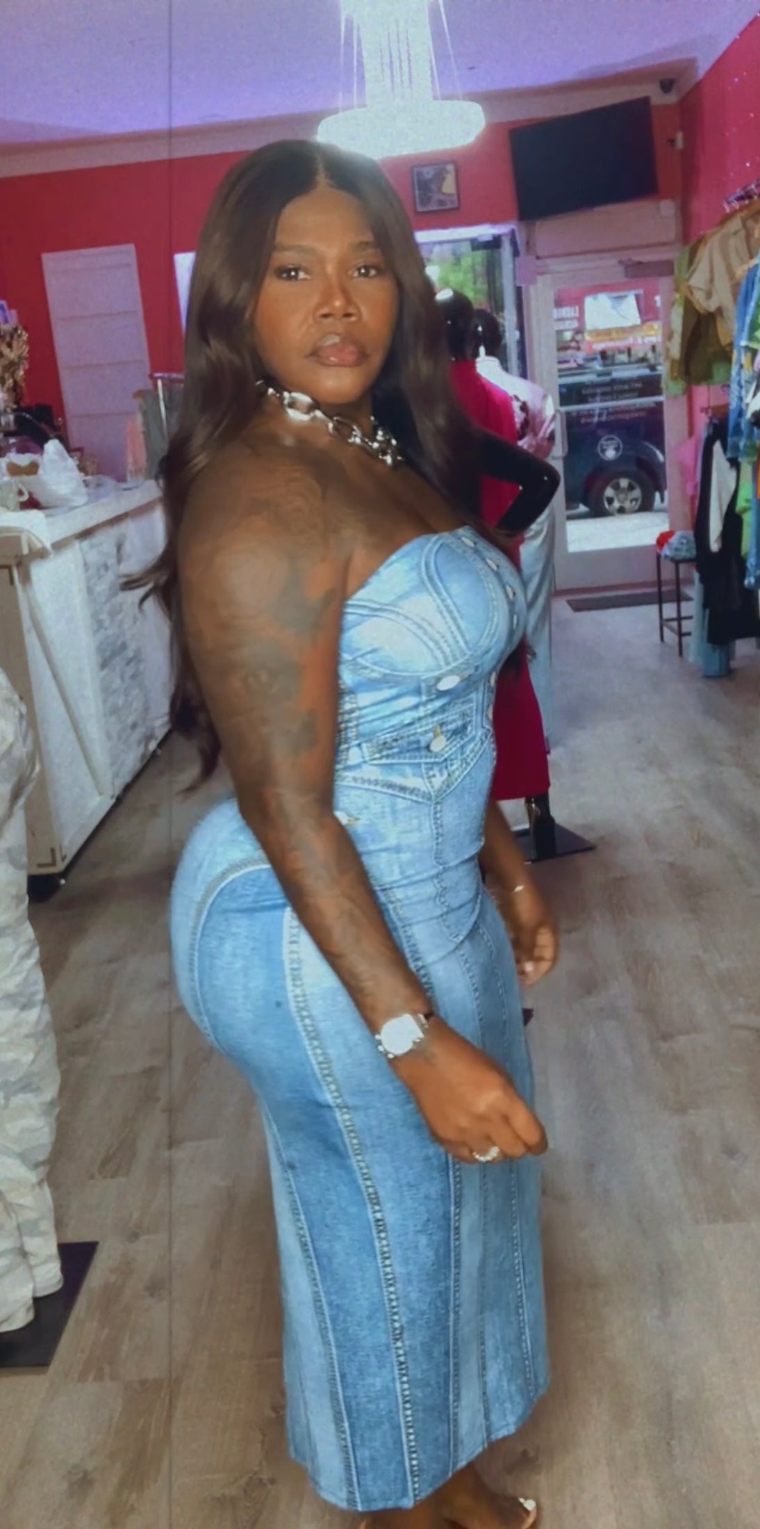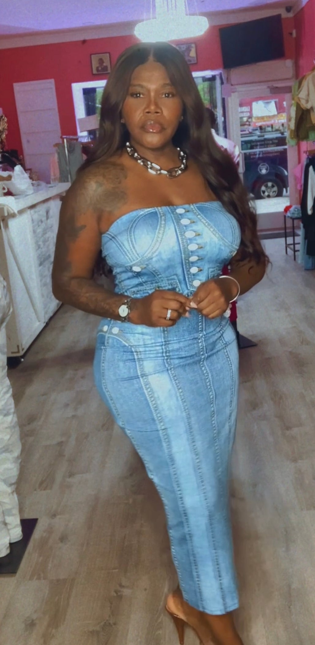Fabulous denim print tube style dress featuring center of back silt detail.