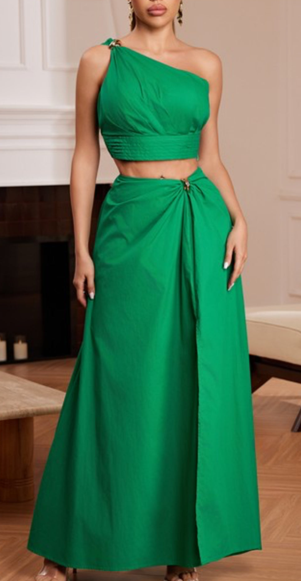 Gorgeous solid color one sleeve crop top with stretch waistband. Stunning gold shell hardware. Fitted skirt with one side split. This will be your Caribbean outfit this summer.