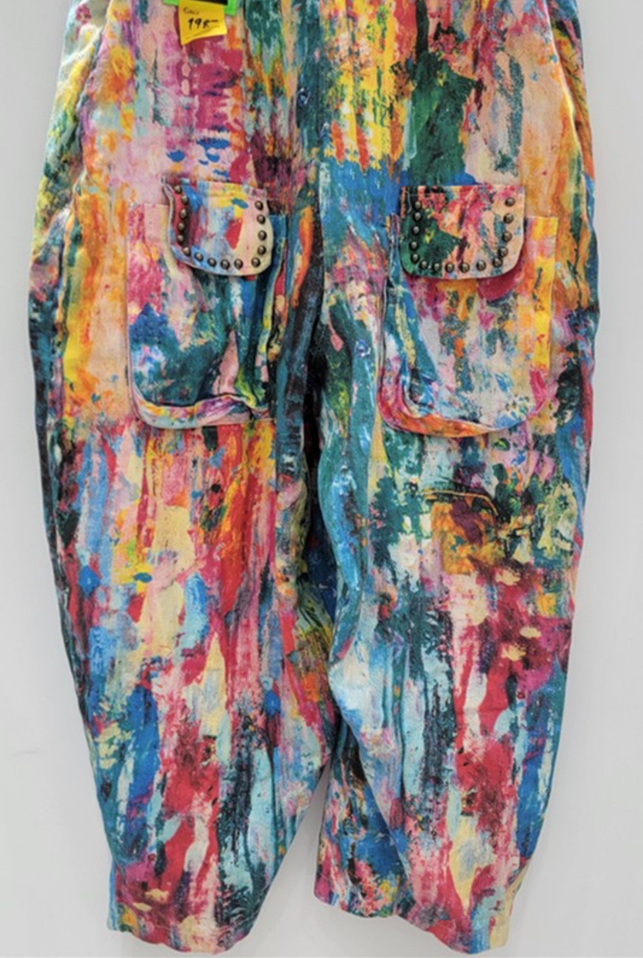 Add a bold splash of creativity to your wardrobe with these vibrant, paint-splattered overalls. Featuring a colorful abstract design that mimics the expressive strokes of a modern art masterpiece, these overalls are perfect for artists, trendsetters, or anyone who loves to stand out. Made from durable, comfortable fabric, they feature adjustable shoulder straps, roomy front pockets with rivet detailing, and a relaxed, oversized fit for all-day wear. Each pair is unique due to the multicolor pattern, making it a one-of-a-kind statement piece. Ideal for festivals, creative workspaces, or casual streetwear look.