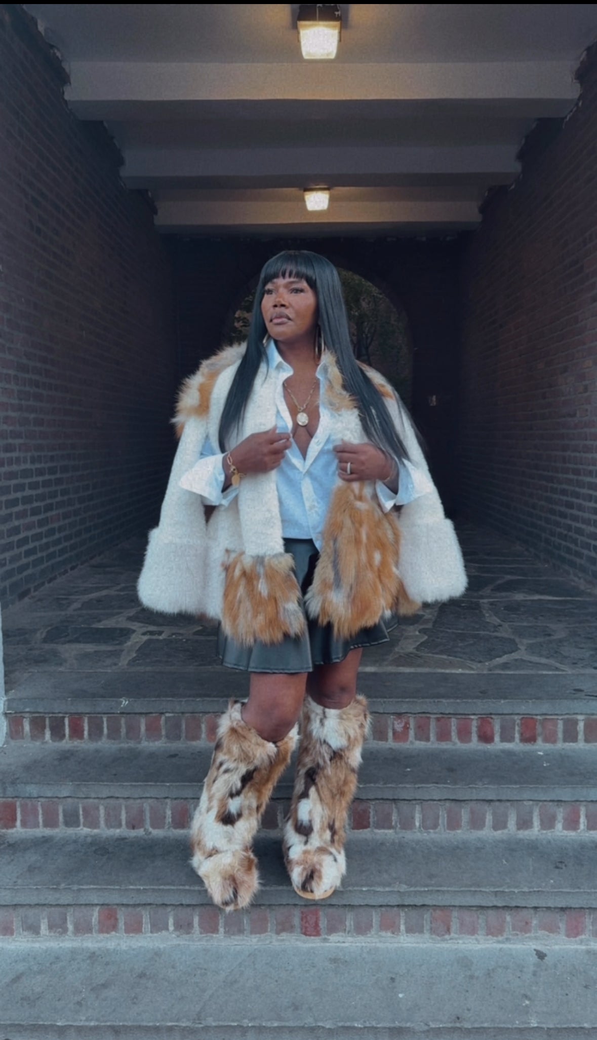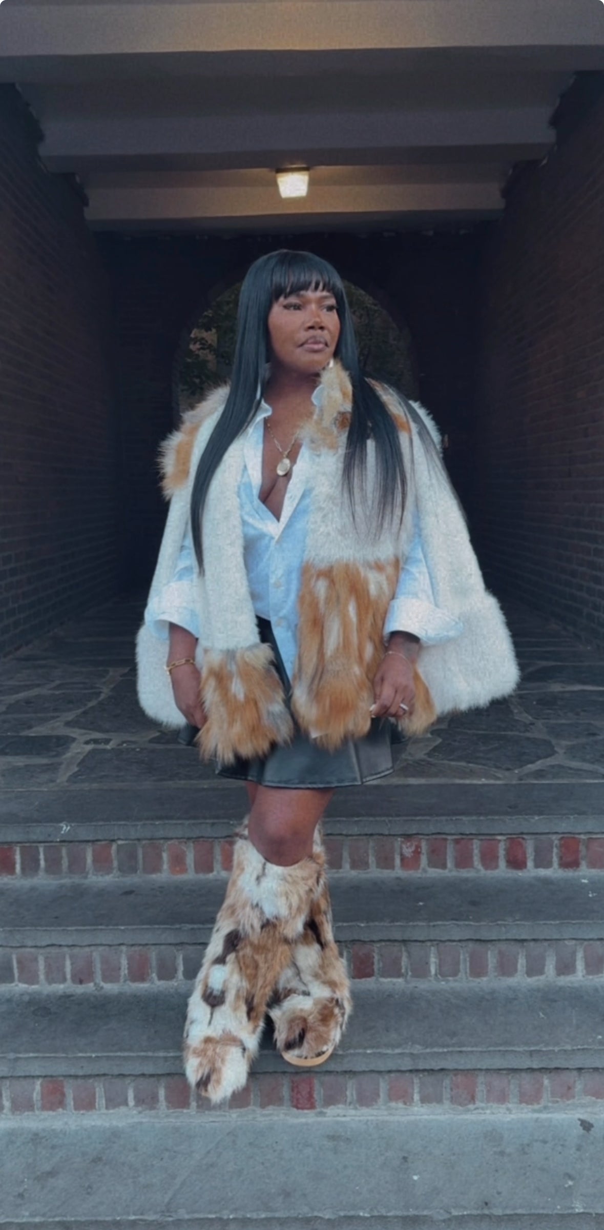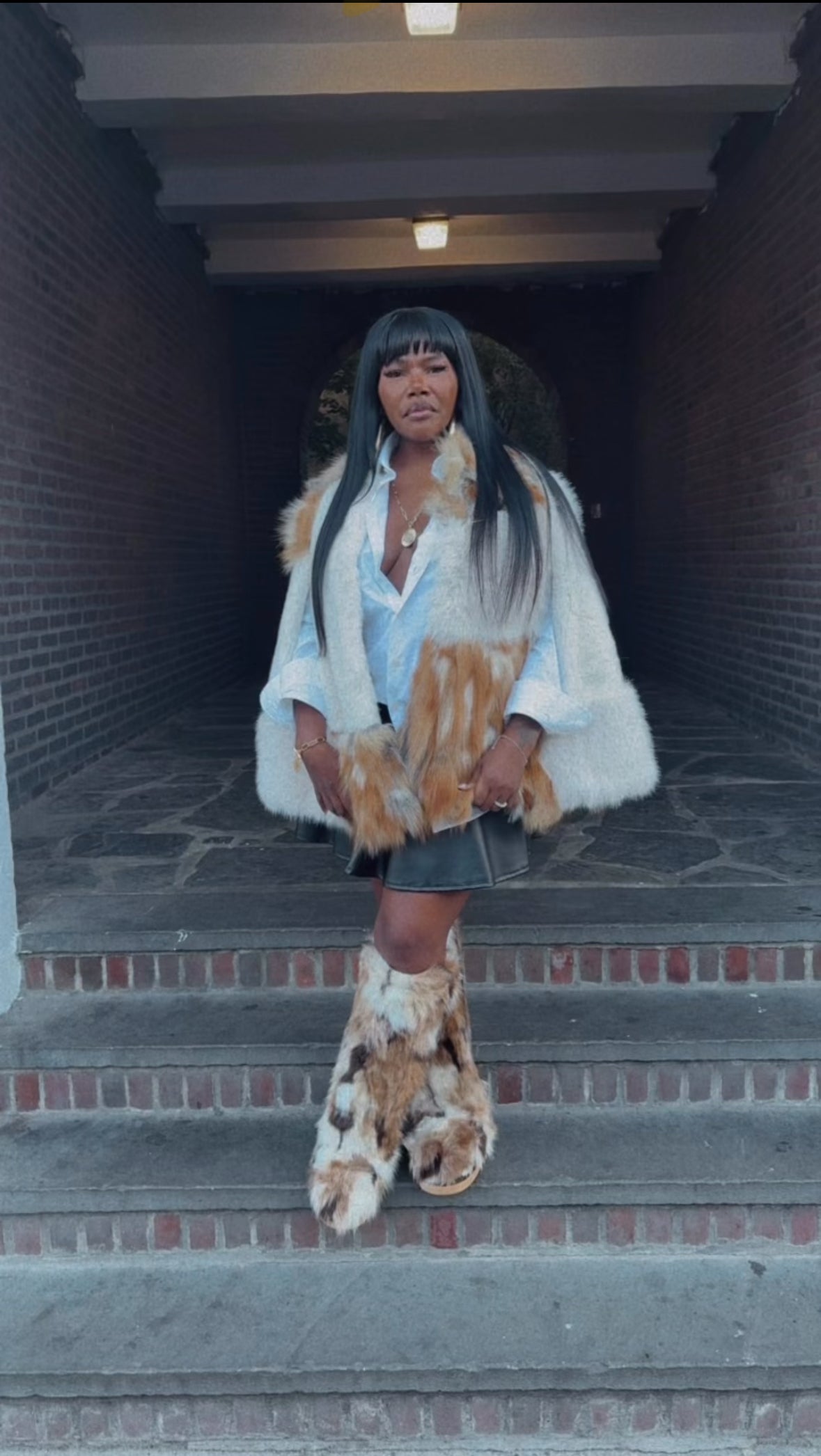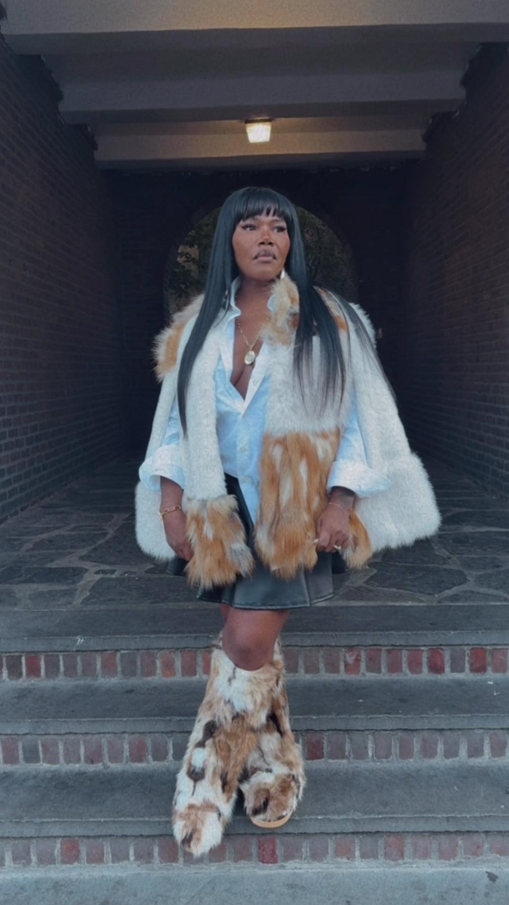 This exquisite piece is a modern capelet crafted from plush, multi-tonal faux fox fur, blending creamy white and rich tawny shades for a spectacular contrast. Designed with a sophisticated, cropped silhouette and openings for the arms, it offers the ultimate high-fashion layering statement without sacrificing mobility. Drape this luxurious garment over a simple denim jacket and distressed jeans to instantly elevate any look from casual to runway chic.