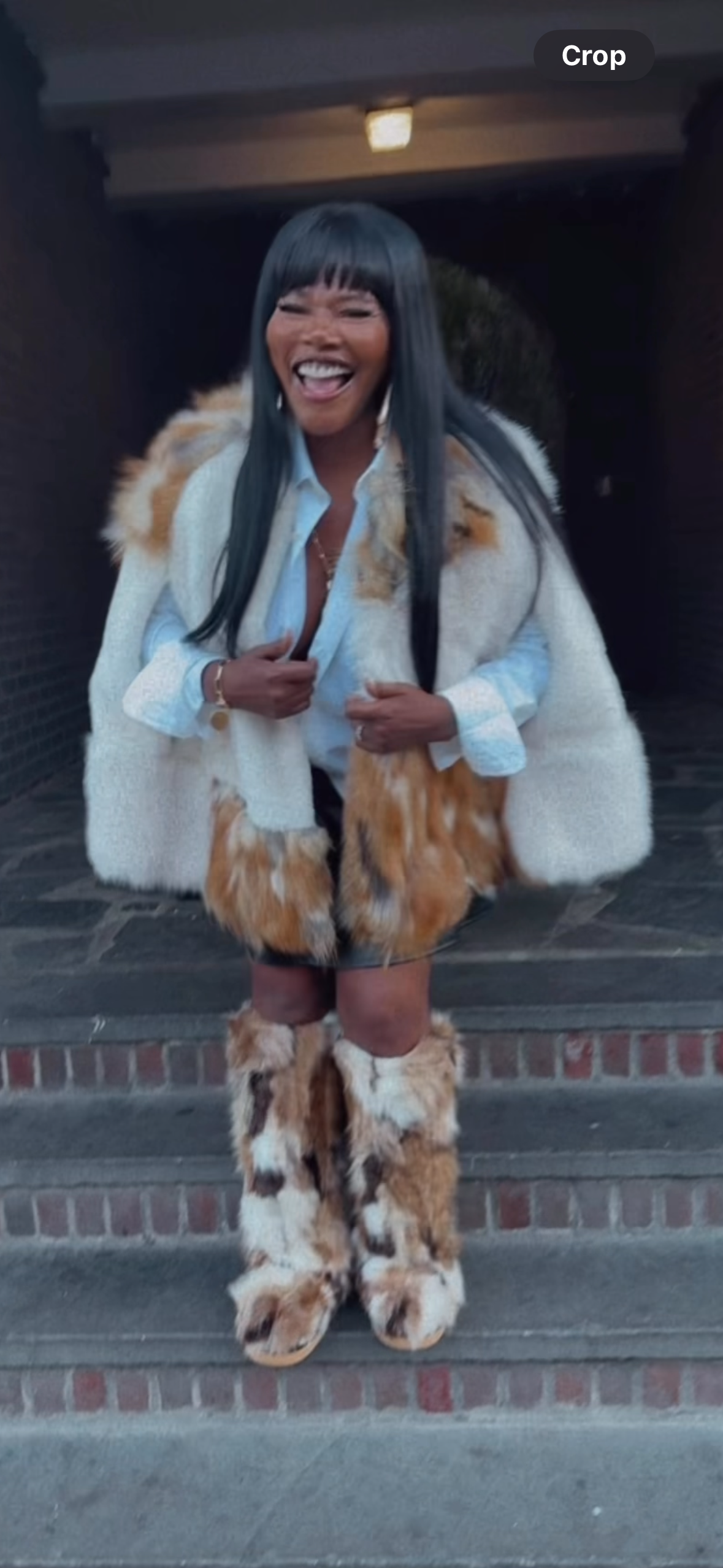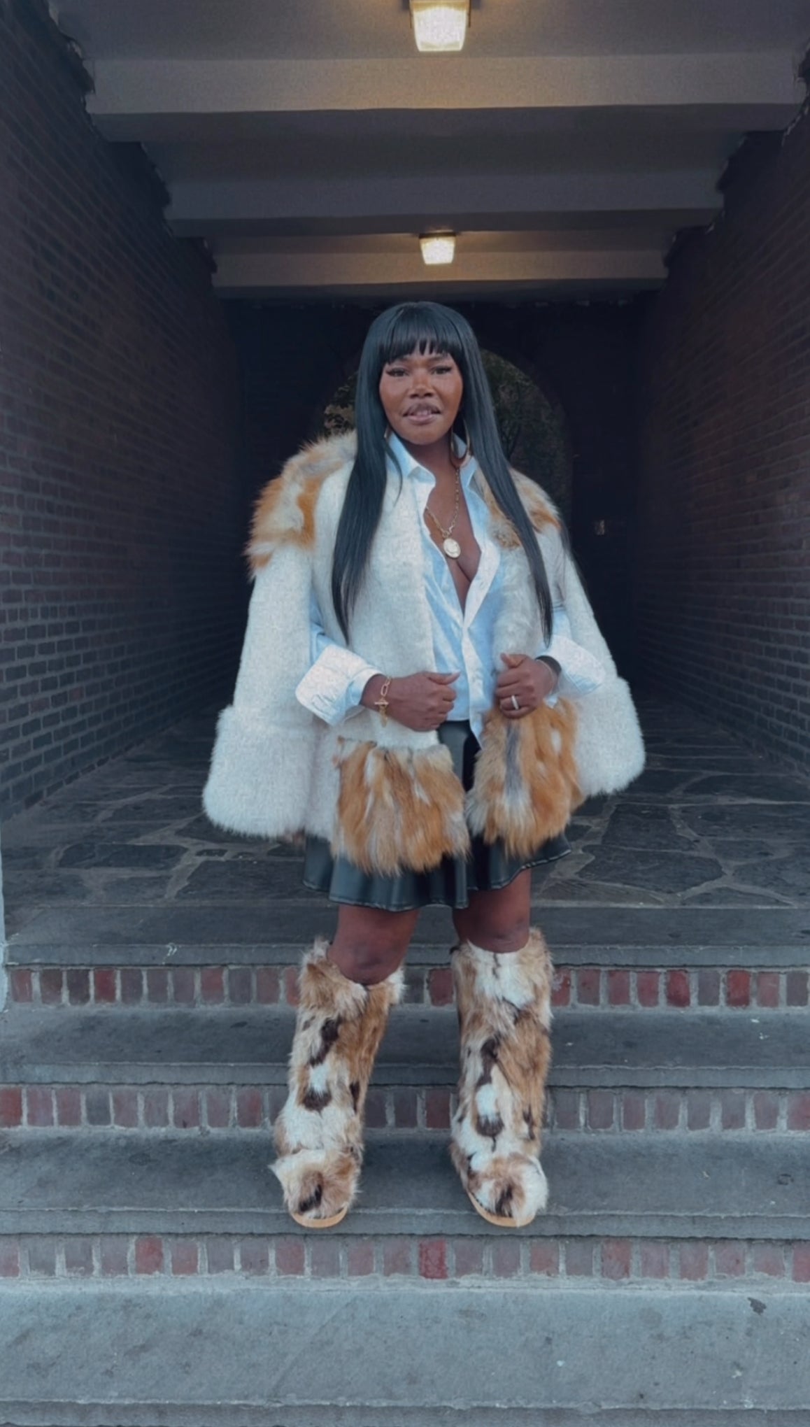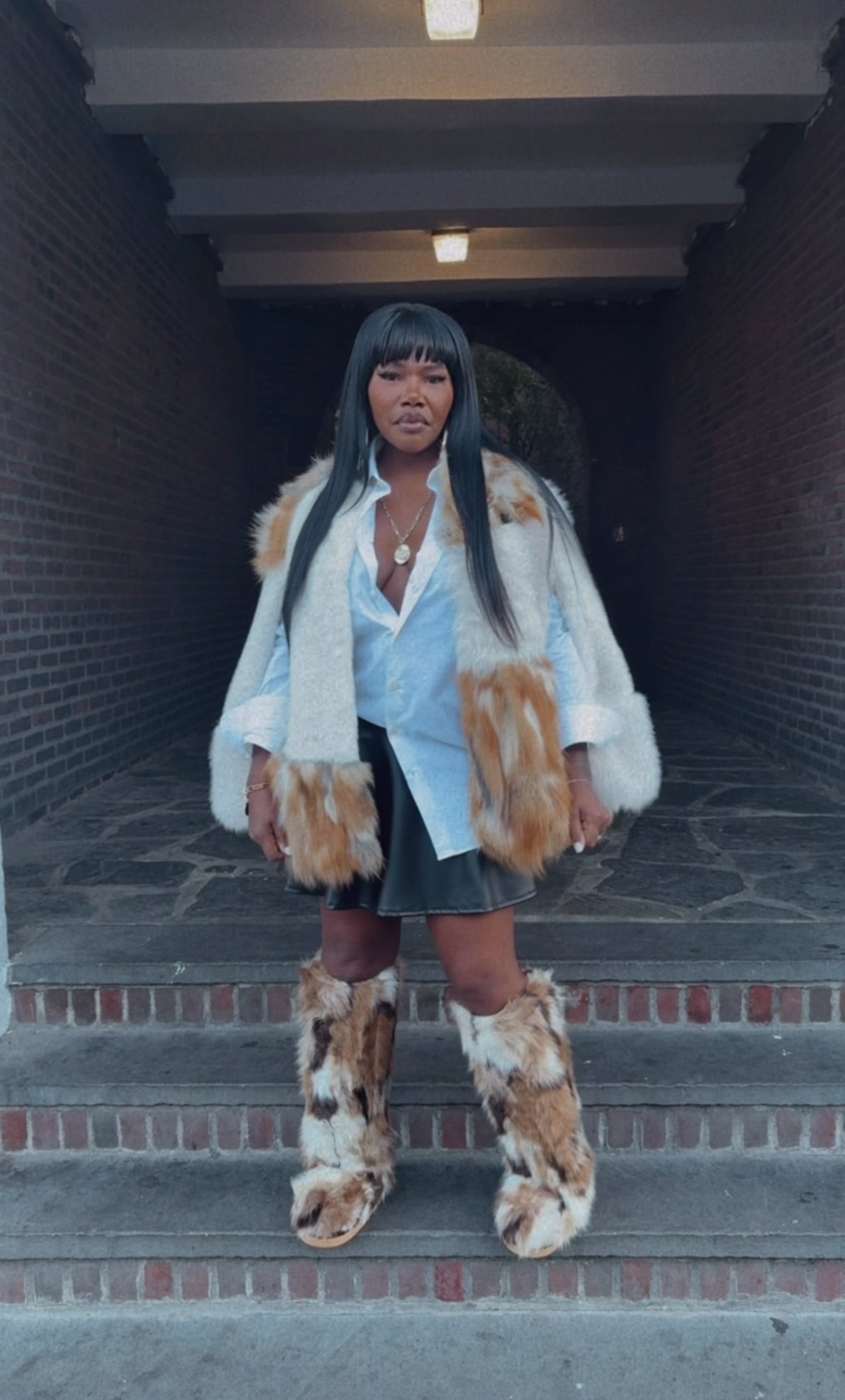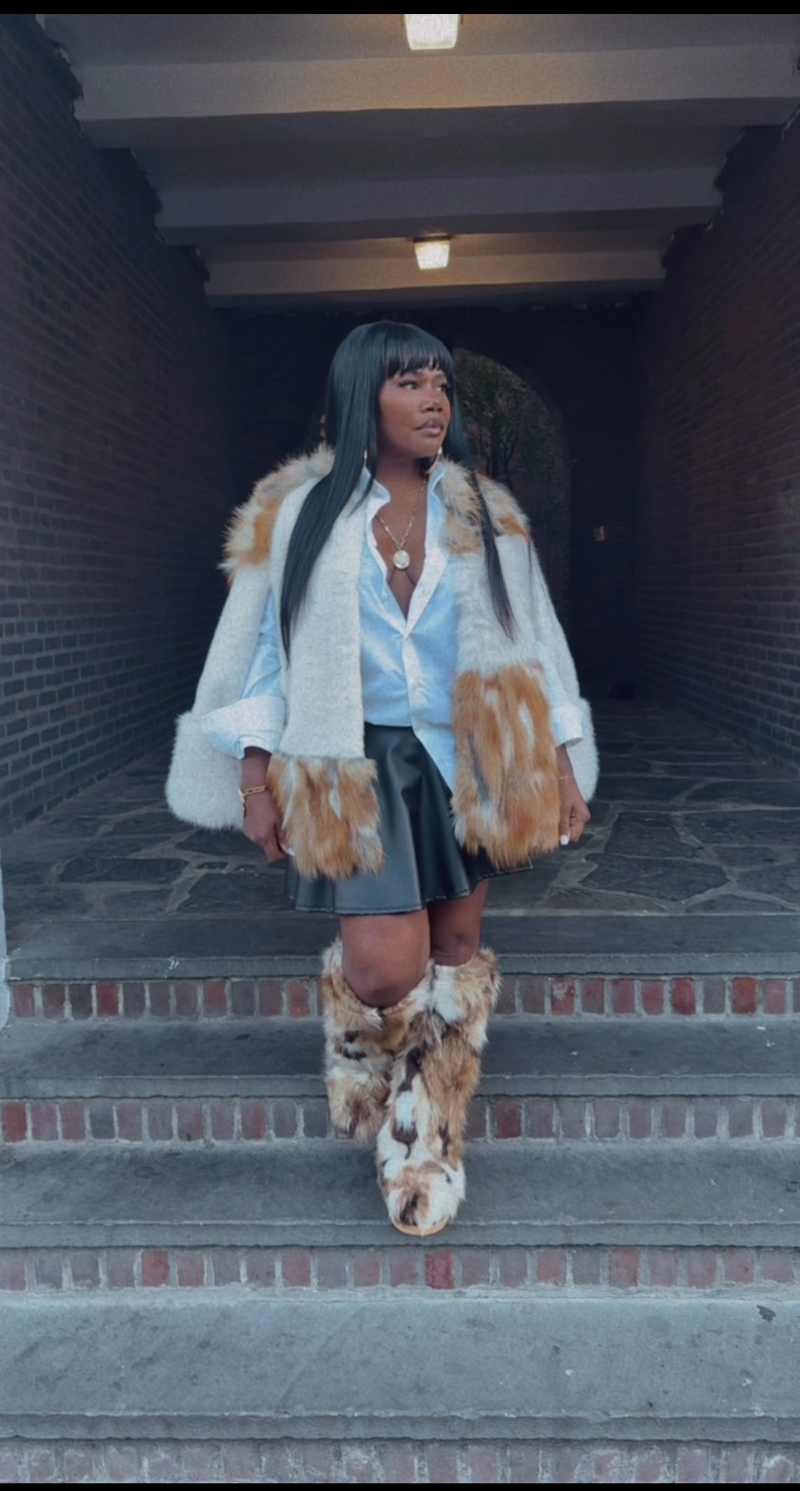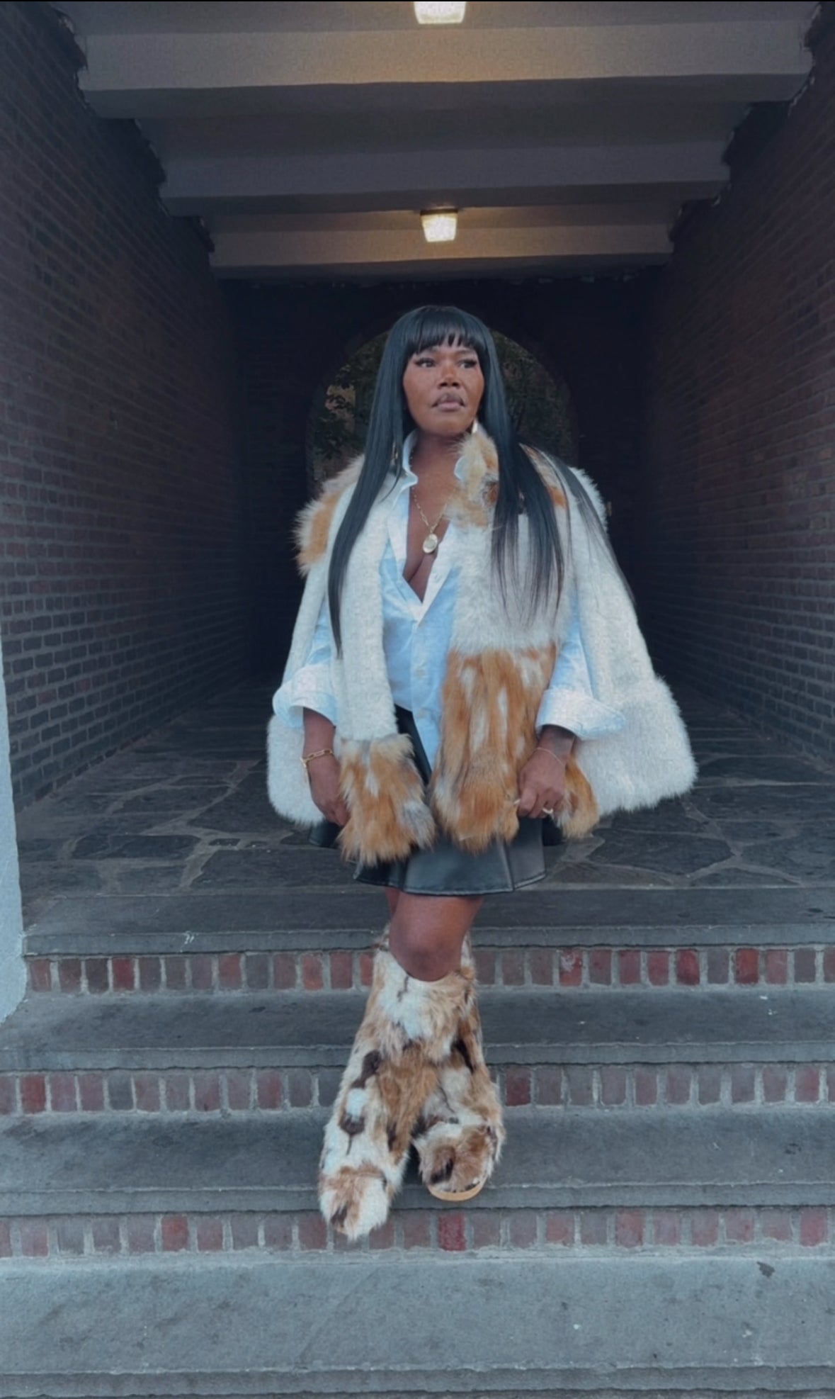 This exquisite piece is a modern capelet crafted from plush, multi-tonal faux fox fur, blending creamy white and rich tawny shades for a spectacular contrast. Designed with a sophisticated, cropped silhouette and openings for the arms, it offers the ultimate high-fashion layering statement without sacrificing mobility. Drape this luxurious garment over a simple denim jacket and distressed jeans to instantly elevate any look from casual to runway chic.