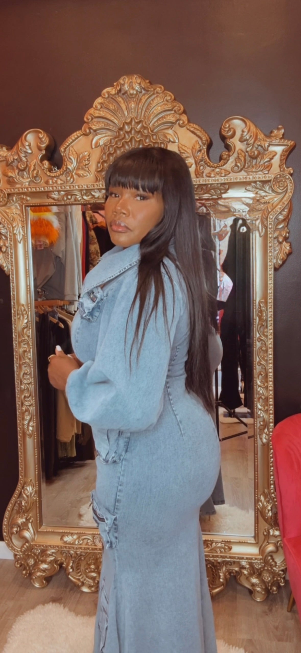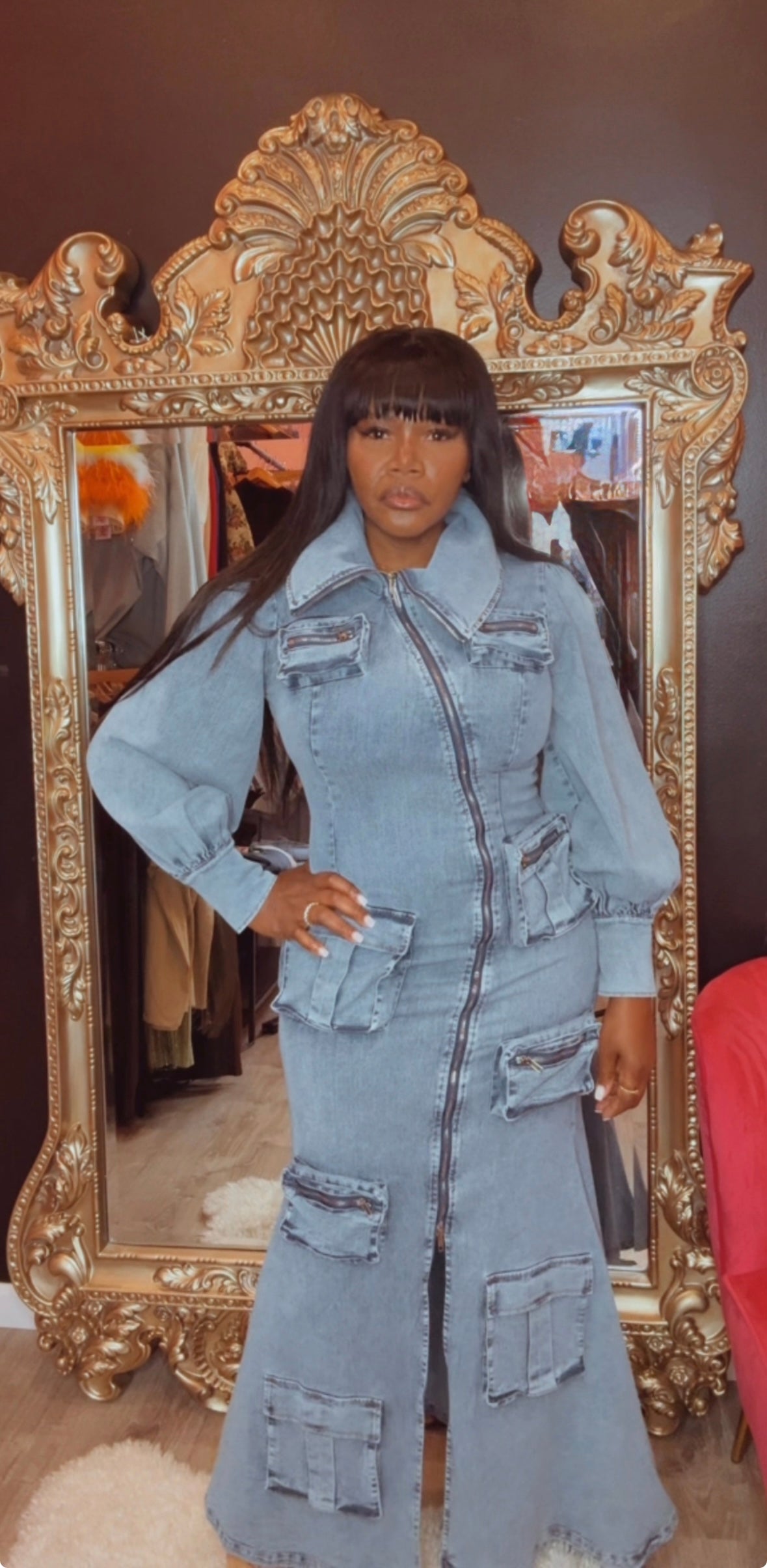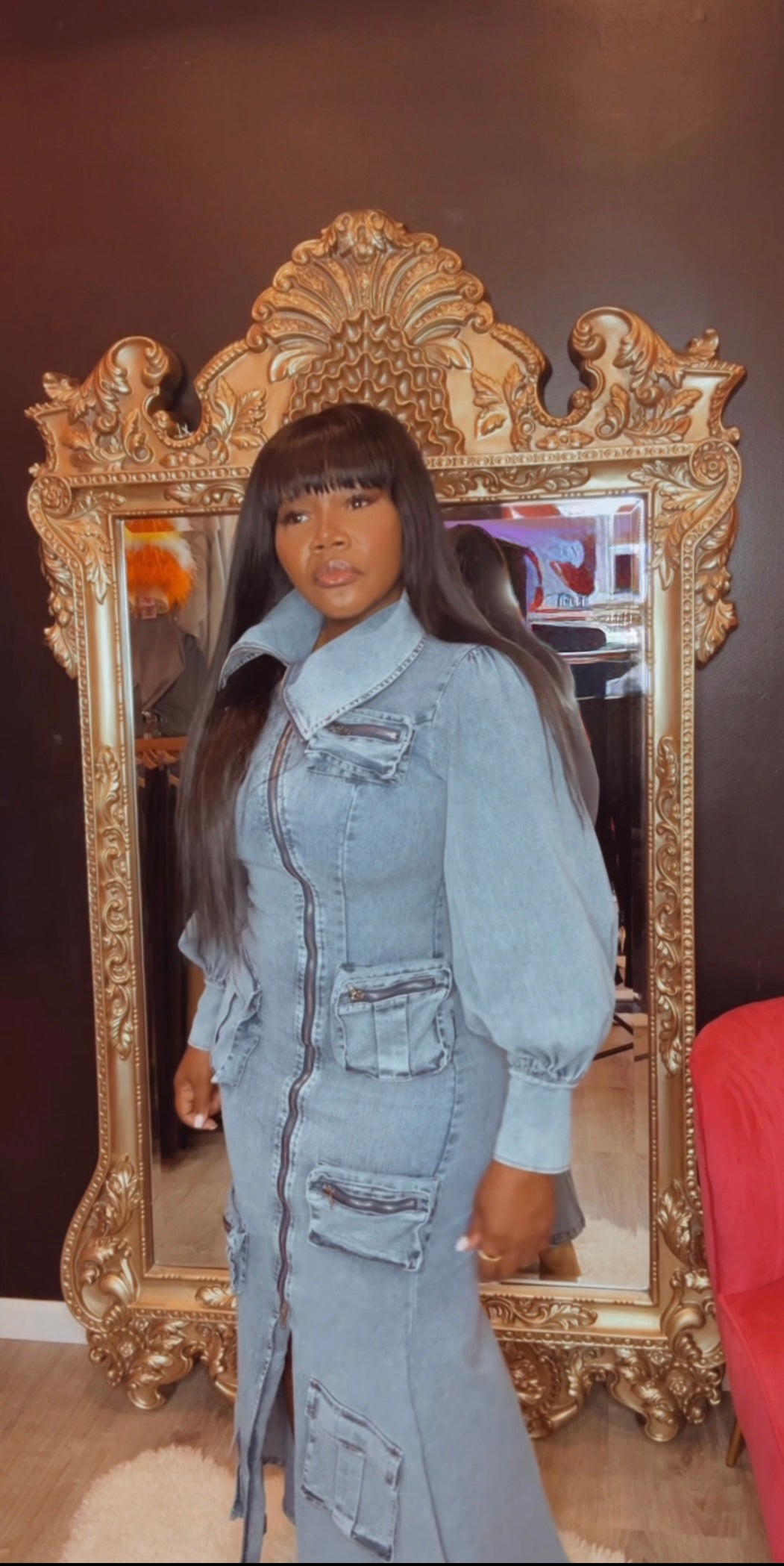 Turn heads with this bold, fashion-foward denim maxi dress that redefines utility chic. Featuring dramatic puff sleeves, a high collar, and multiple oversized pockets with zipper and flap detailing, this full-length zip-up piece is as functional as it is fierce. Perfect for the confident trendsetter who isn't afraid to make a statement.