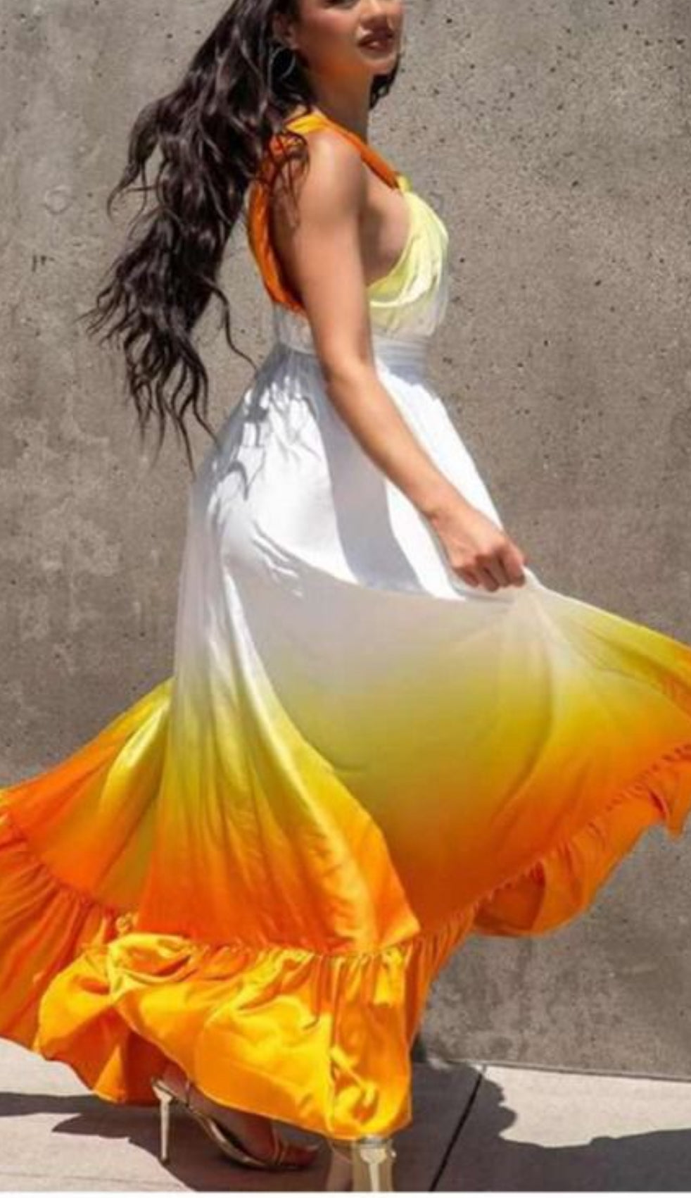 Introducing the Sunburst Tornado Mxi Dress! This stunning piece features an asymmetrical yellow-to-orange ruffled waist, and rear zipper closure. Embrace the sun in style and make a statement with this must-have dress.