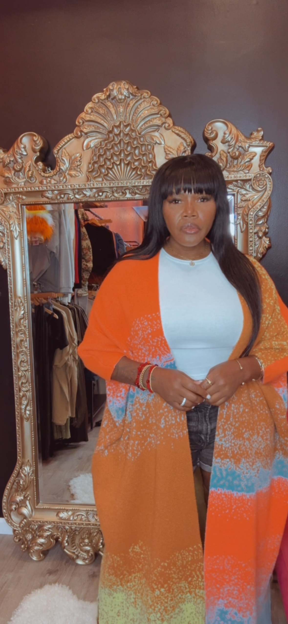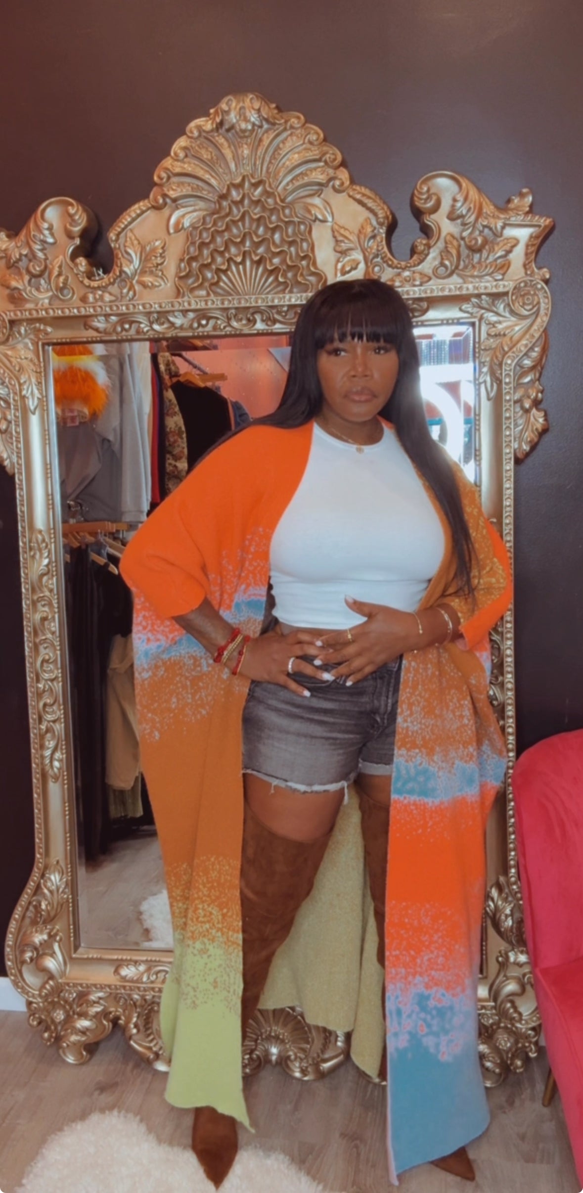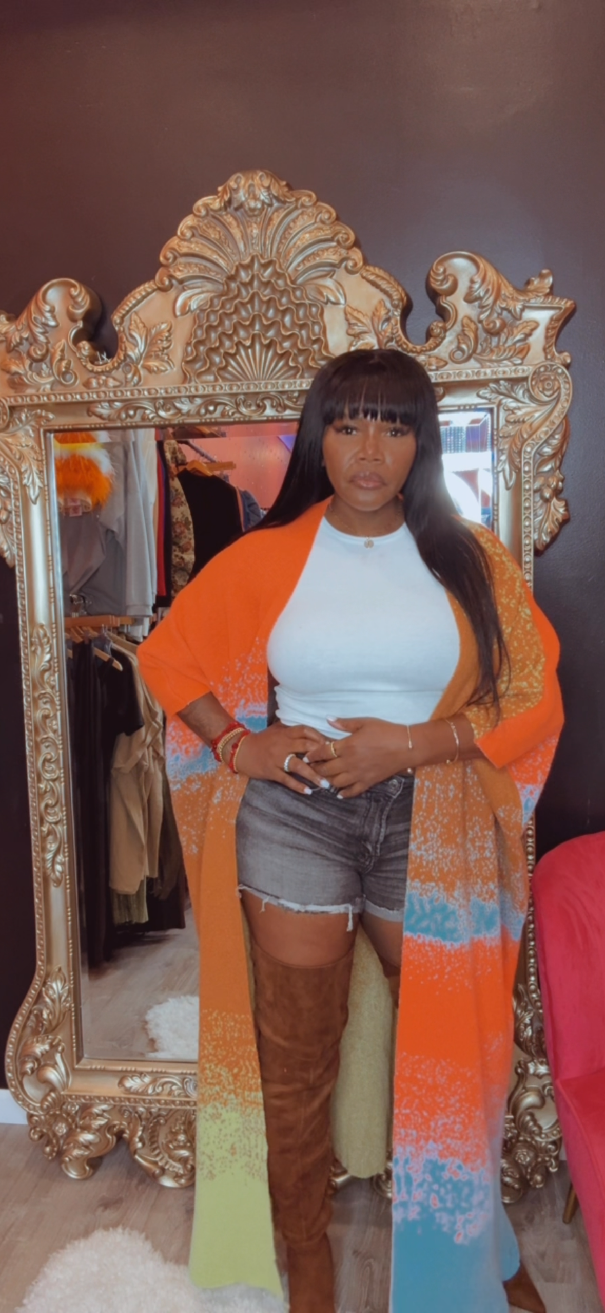 Elevate your wardrobe with this bold and vibrant full-length open front cardigan. Featuring a stunning gradient design that transitions from coral to rust, sky blue, and lime green, this cozy statement piece adds a splash of color and effortless flair to any outfit. Perfect for leaving over casual or chic ensembles.