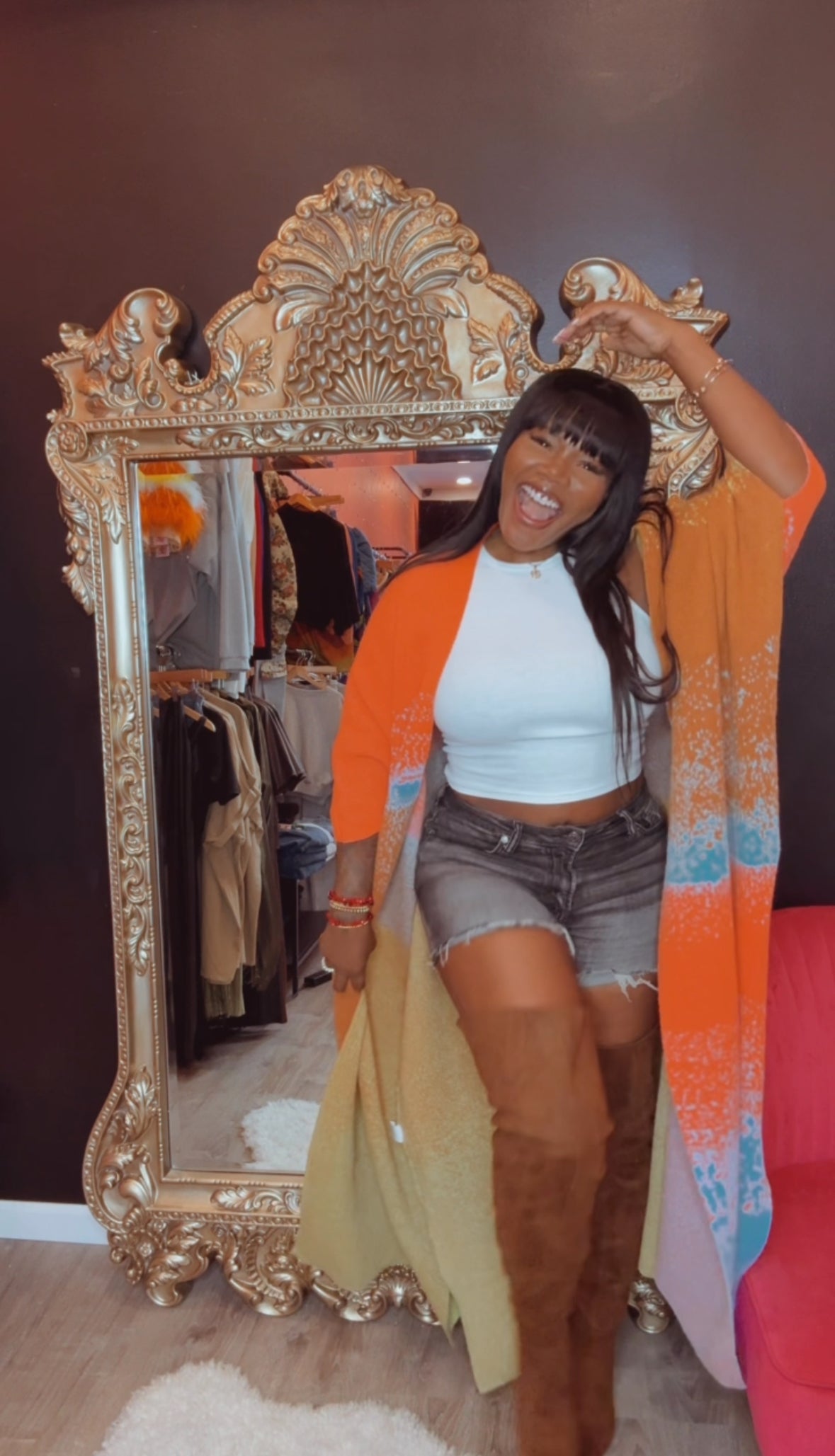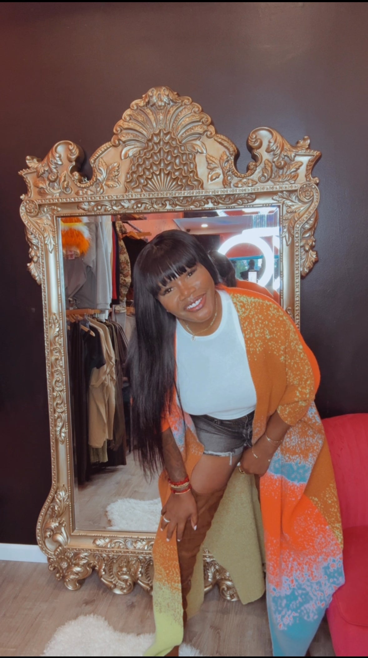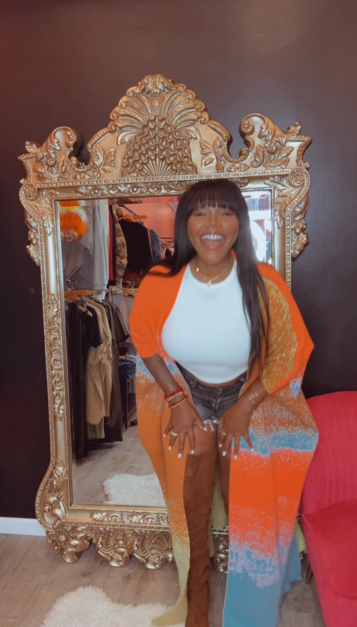 Elevate your wardrobe with this bold and vibrant full-length open front cardigan. Featuring a stunning gradient design that transitions from coral to rust, sky blue, and lime green, this cozy statement piece adds a splash of color and effortless flair to any outfit. Perfect for leaving over casual or chic ensembles.