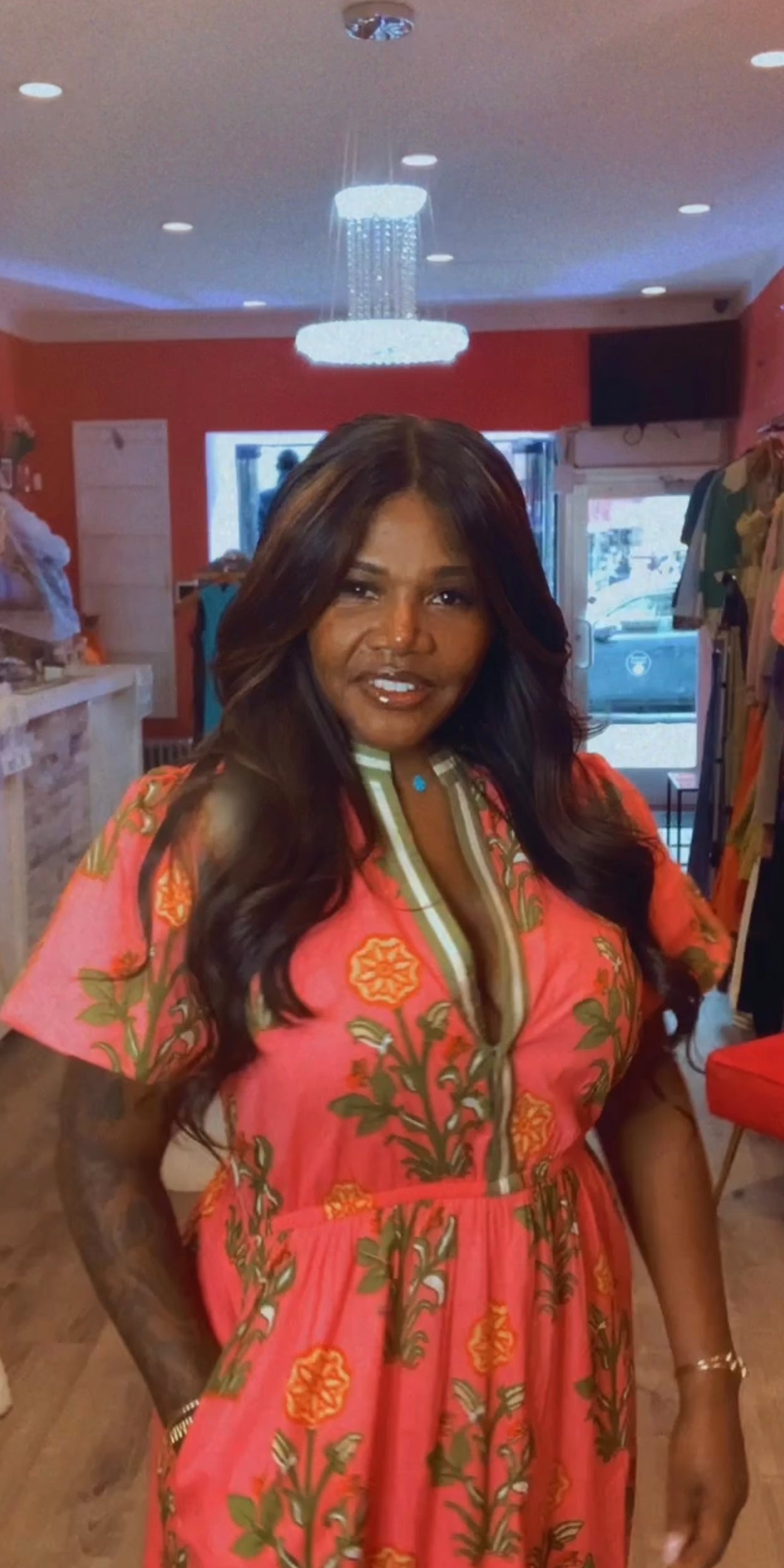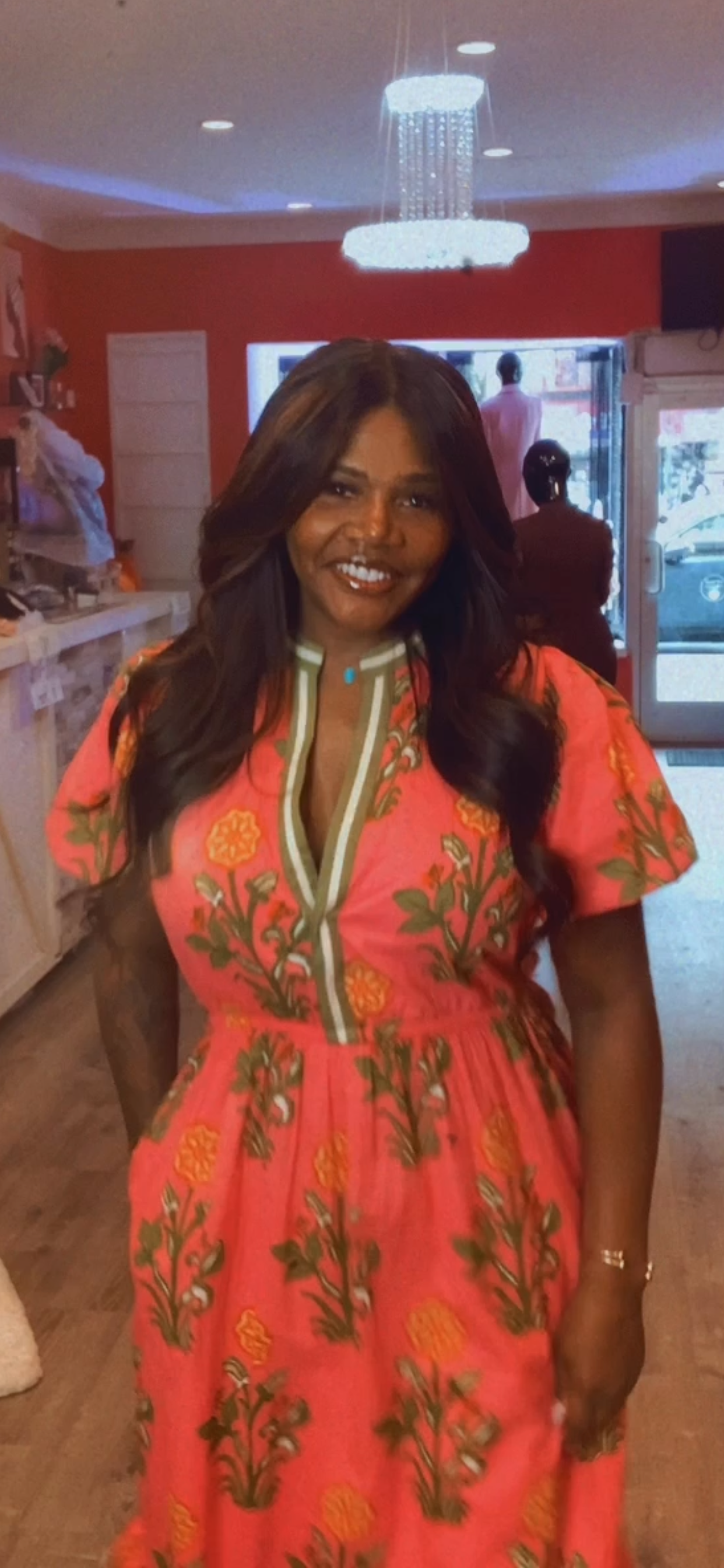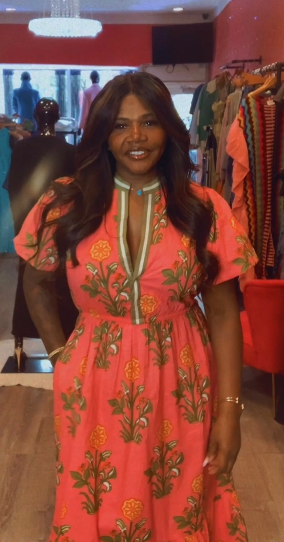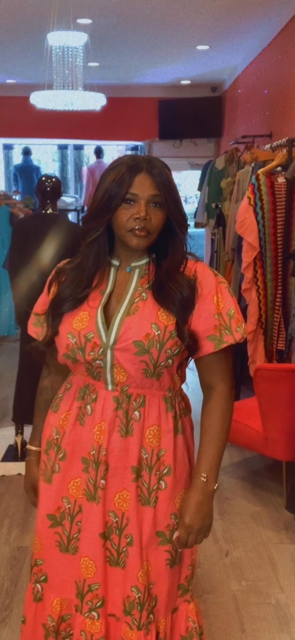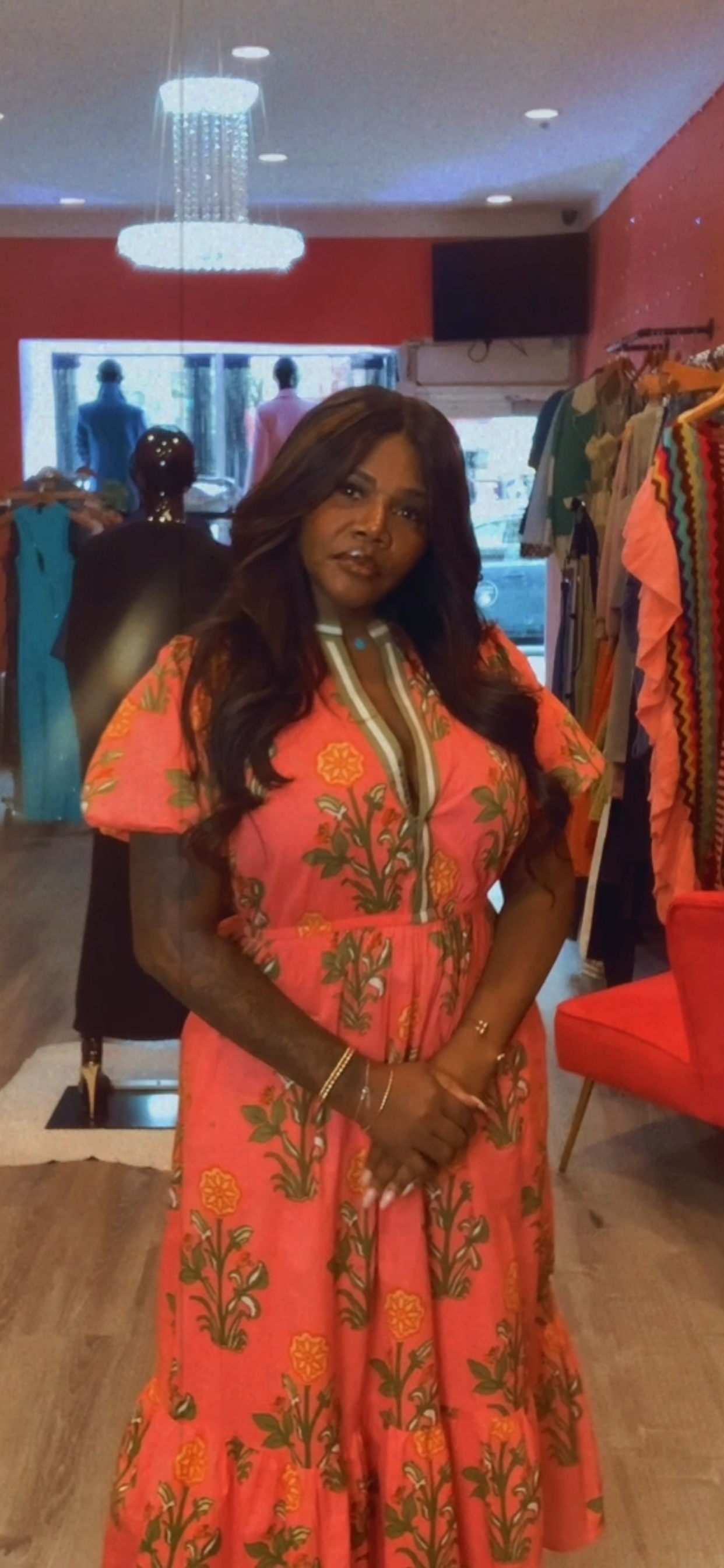 Sweet Pink floral print tiered dress with short puff sleeves. Features V-neck with button clasps, pockets at the sides, Lined and lightweight.