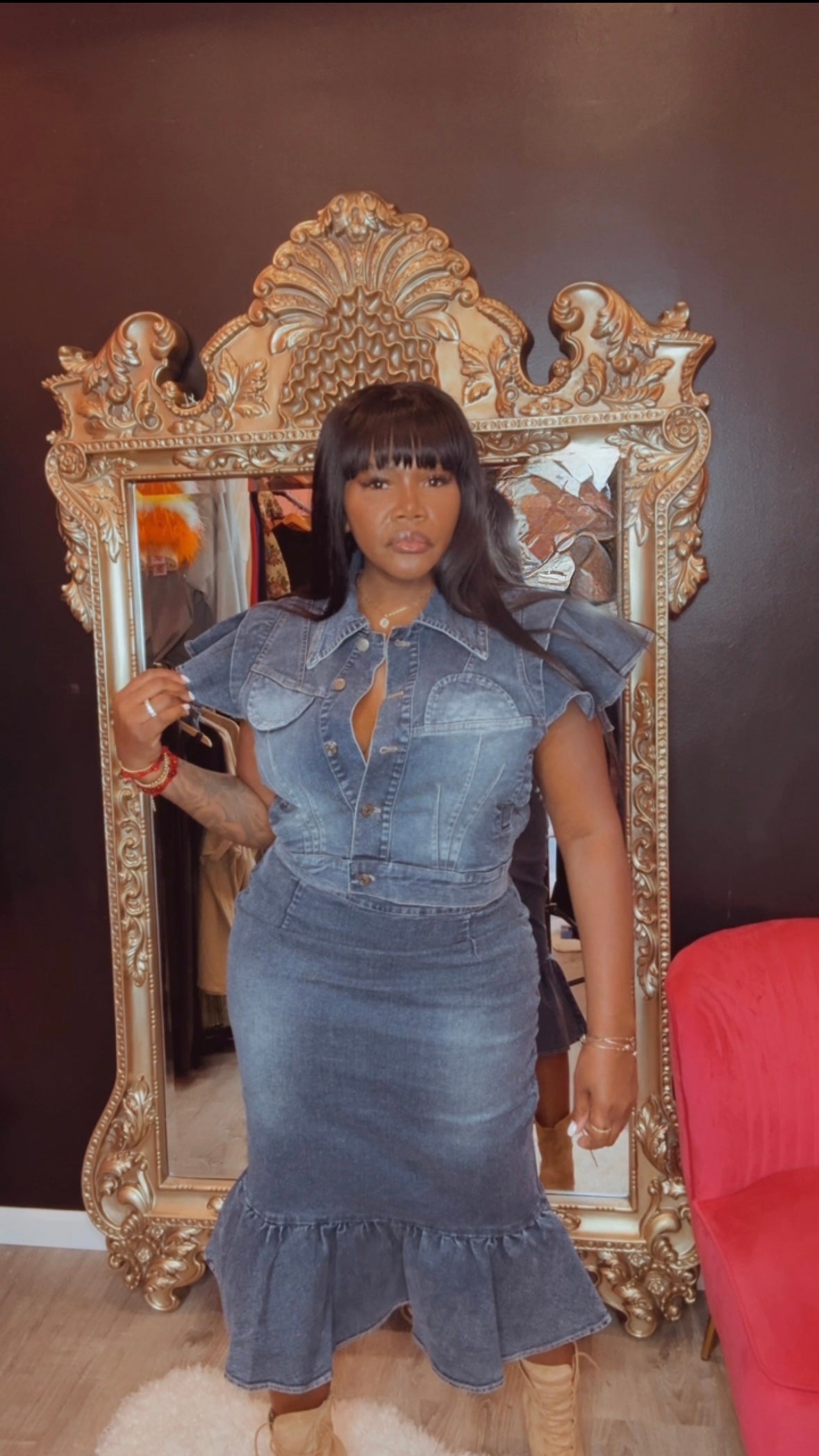 Paired with a flattering high-waisted midi skirt, the set is finished with a dramatic ruffled hem that adds softness and movement. The vintage-inspired dark wash and precision stitching lend a timeless appeal, while the unique silhouette elevates it into statement territory.