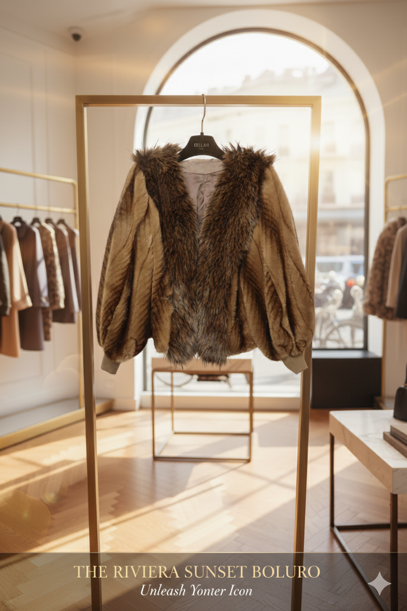 A symphony of rich textures and autumnal hues, this mink-toned jacket is a masterpiece of mixed faux furs. The striking V-neck is framed by a bold, dark collar that contrasts beautifully with the striped pattern and voluminous, lantern sleeves. This eye-catching silhouette is perfectly tailored for a confident evening statement, adding a flash of untamed glamour to any ensemble.